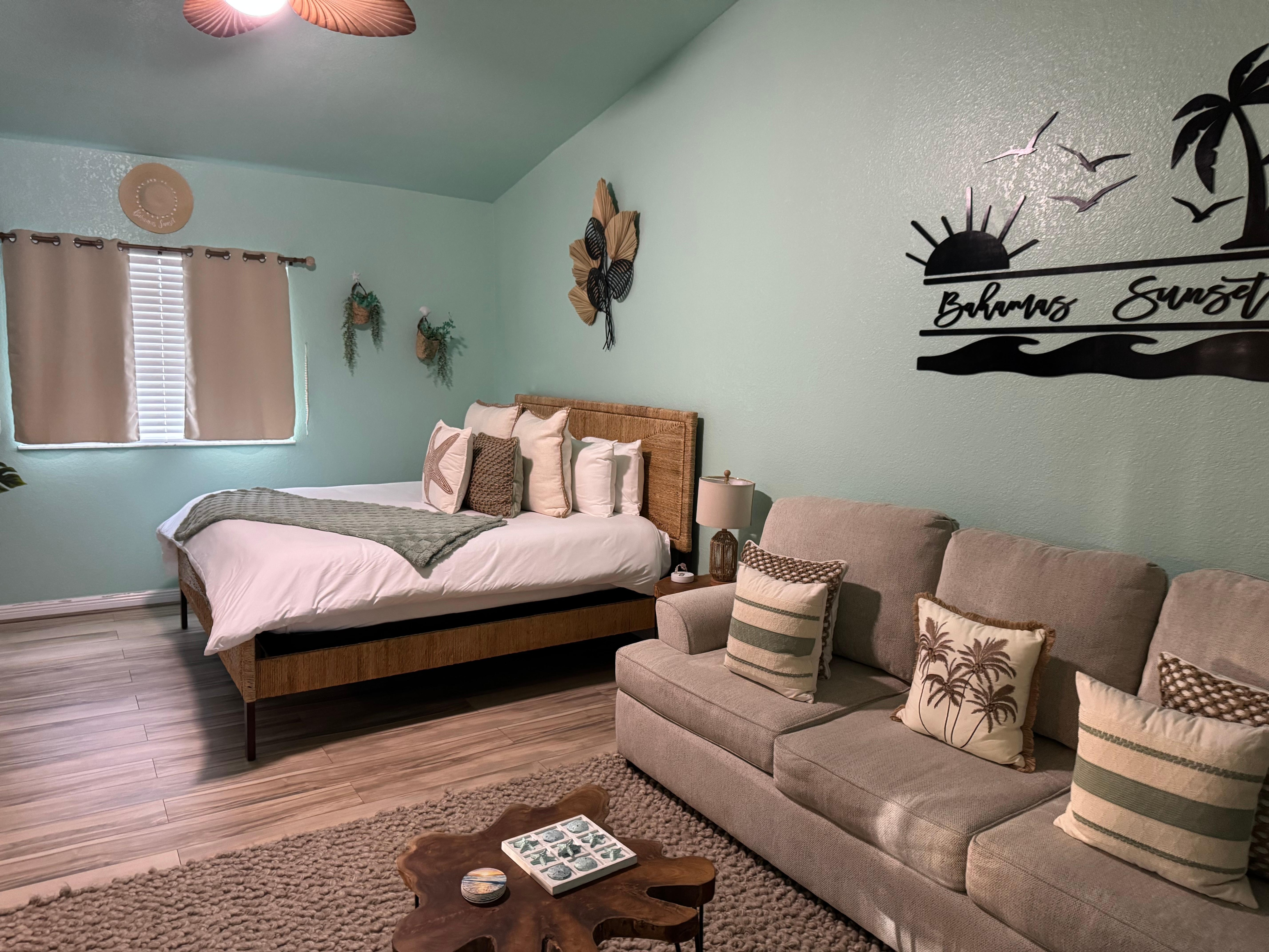 The open layout features a King Size Bed and a Queen Sleeper Sofa, perfect for couples or family getaways! Wake up to beautiful views of the Ocean from the bed!