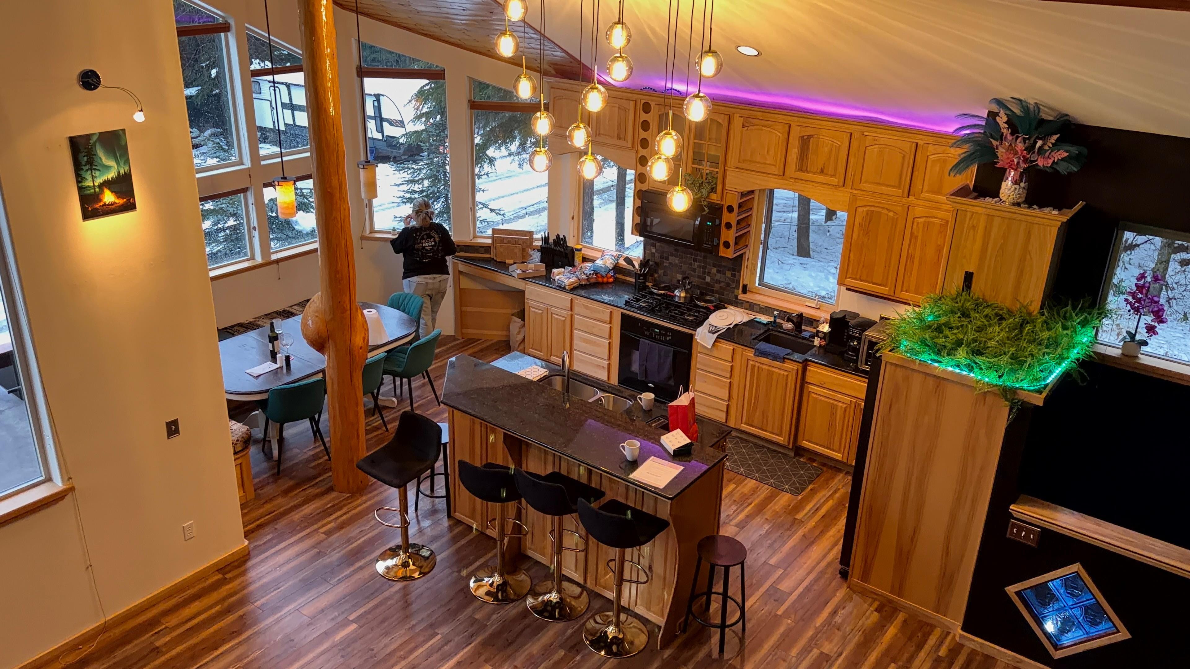 Discover the perfect Girdwood retreat with fresh updates and modern touches throughout. This spacious home now features brand-new wood flooring, fresh paint, modern light fixtures, and new artwork—including aurora borealis pieces that capture the spirit of Alaska. The entryway has been refreshed with ski-inspired décor and convenient racks for snowboards and ski gear, while half the garage has been converted into a fun game room with a pool table and dart boards. The home comfortably sleeps 12, making it ideal for families and groups.