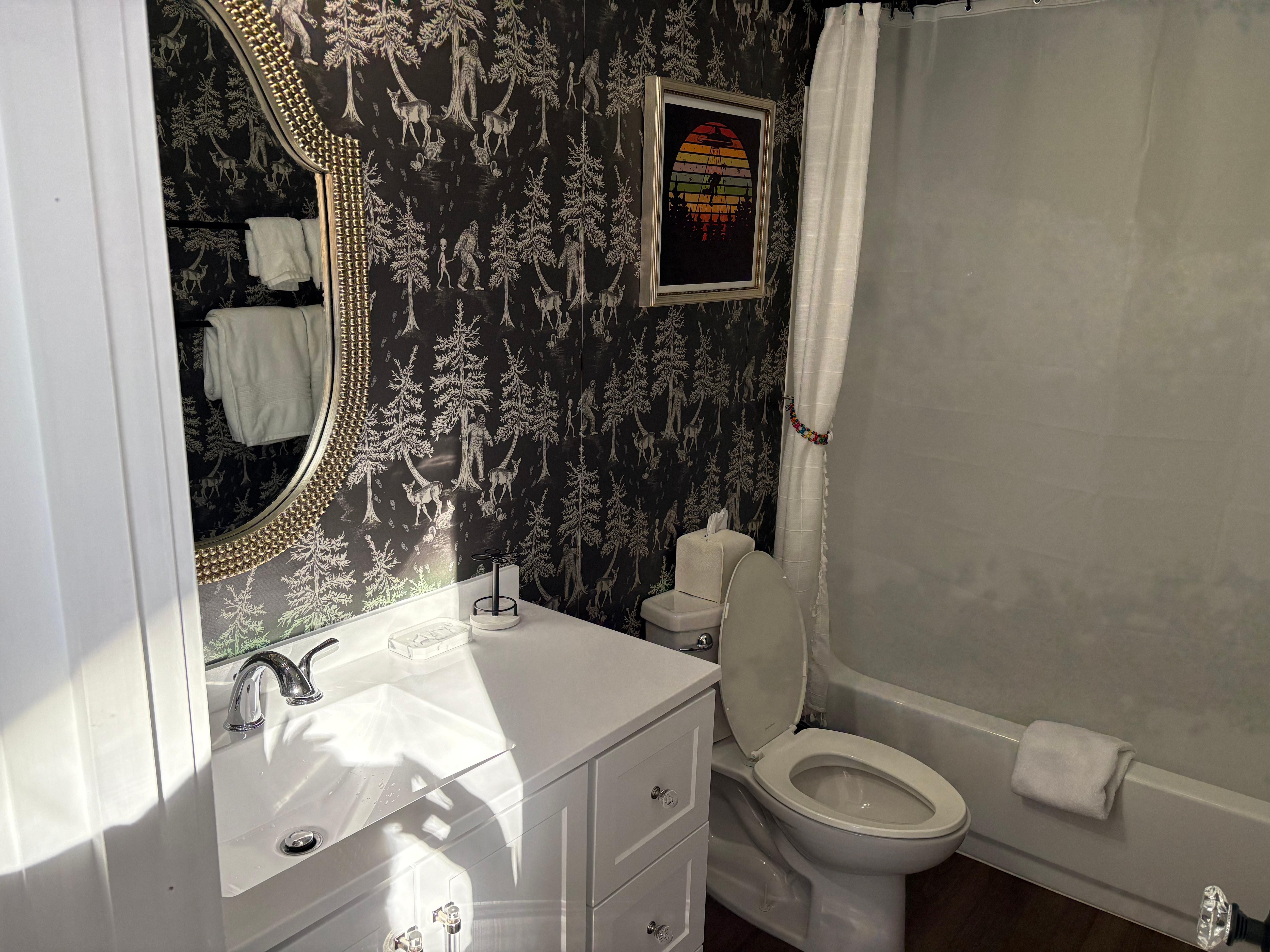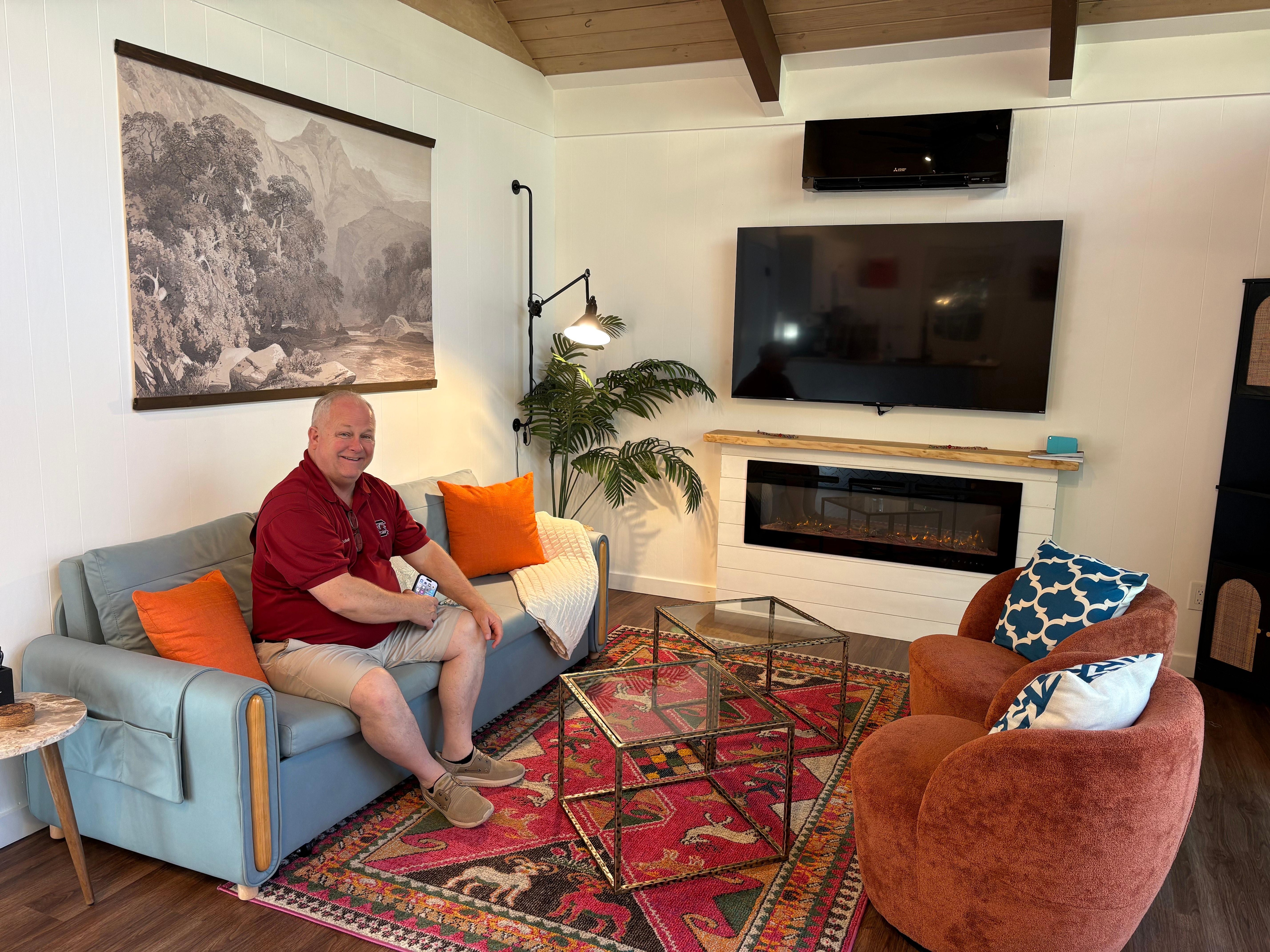 The open-concept living area features rustic wood finishes, a comfortable pullout sofa, and an electric fireplace to create a warm and inviting atmosphere. The fully equipped kitchen makes meal preparation easy, and the dining area provides a charming space for enjoying meals together. The spacious bedroom comes with a plush bed, ensuring a restful night's sleep. You will have plenty of closet space in a separate laundry room with washer and dryer. Find all modern amenities: Roku TV with access to streaming services, electric fireplaces for a super cozy ambience, high-speed Wi-Fi, and air conditioning/heating for year-round comfort.