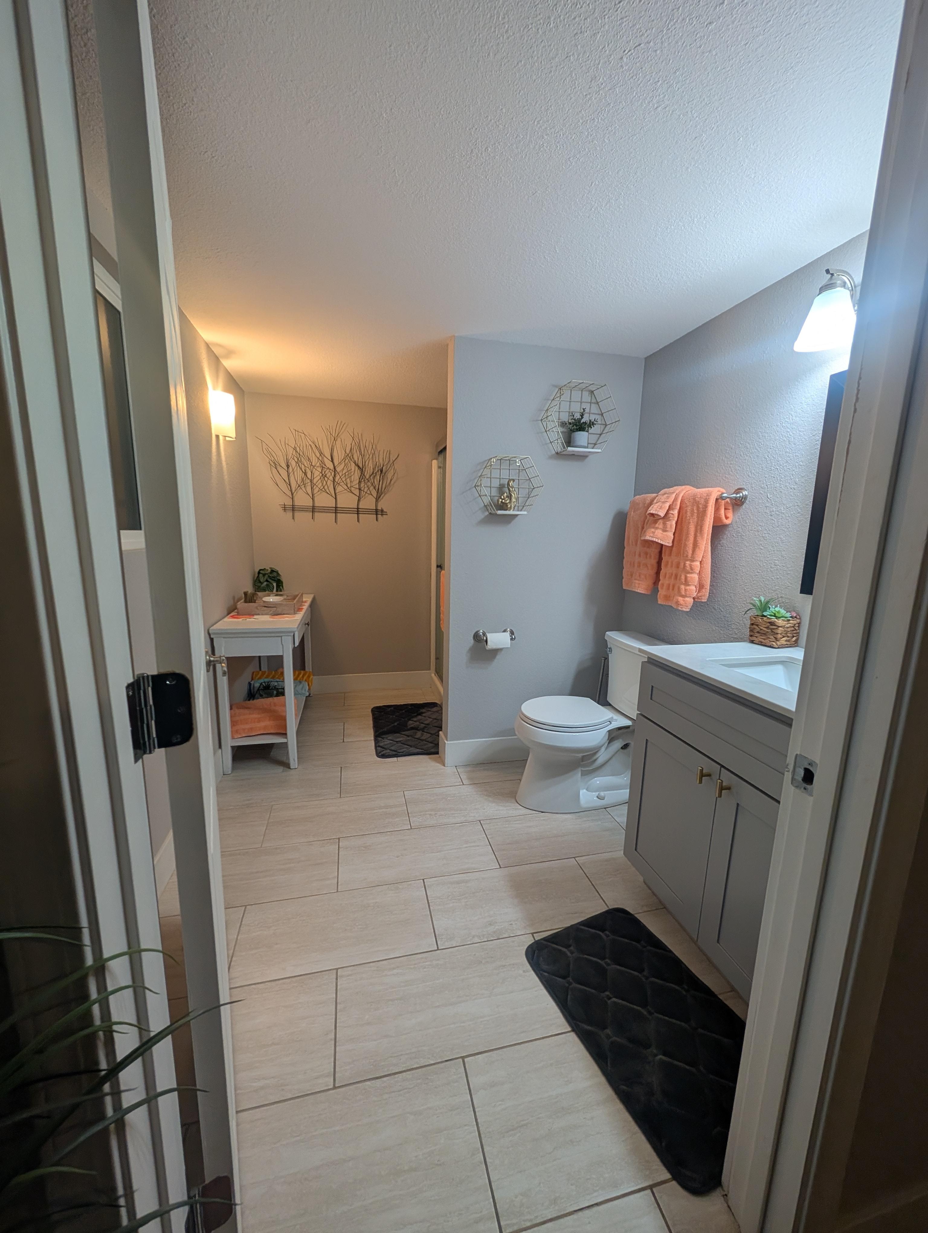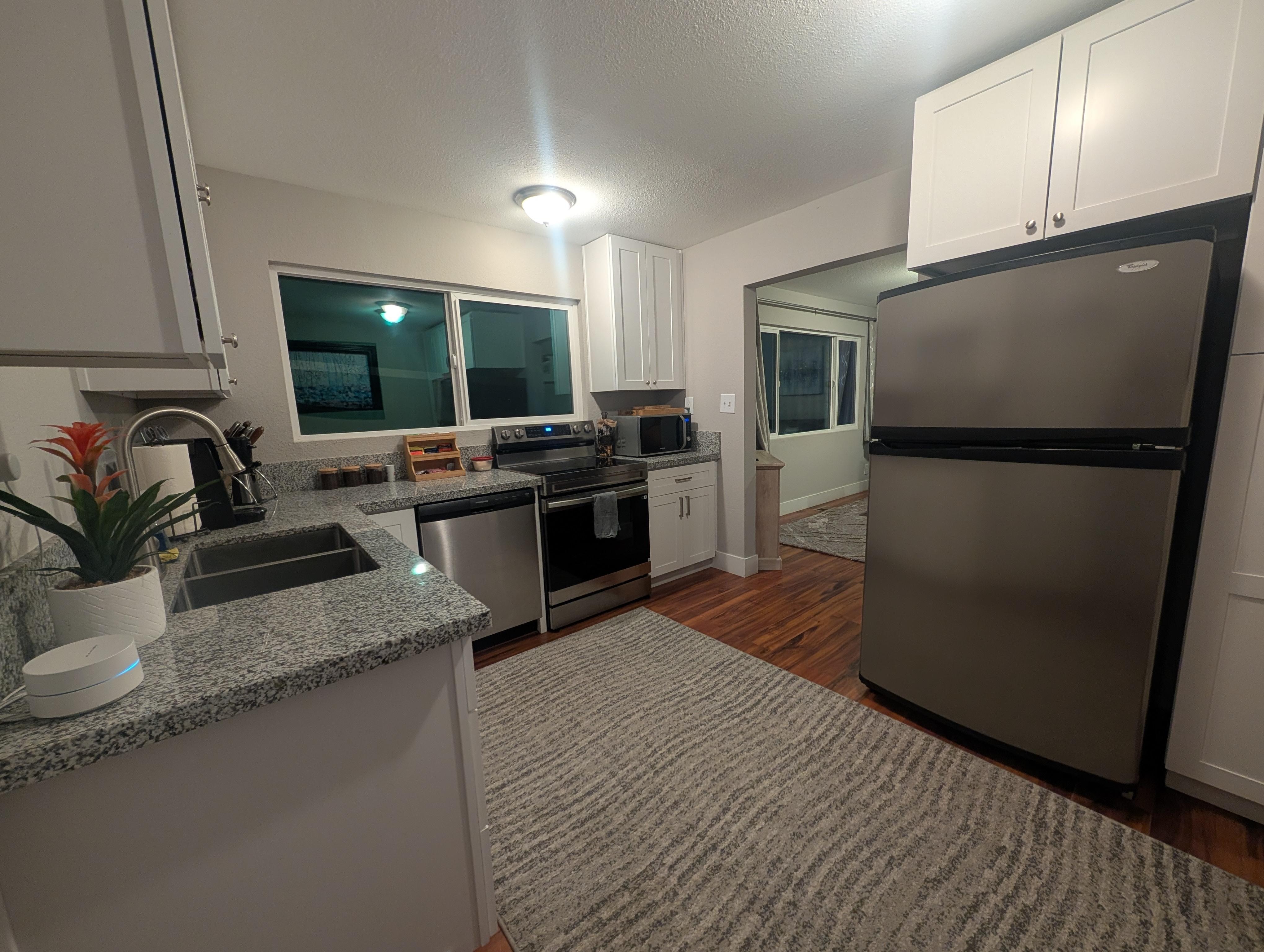 You will enter through a touch pad door lock into your newly remodeled suite that boasts modern décor and finishes throughout. There is a full-size kitchen with anything you may need to prepare a home cooked meal. The kitchen has a microwave, electric stove top with oven, toaster, Keurig and coffee pot (with some coffee and tea included), refrigerator with freezer, dishwasher, dishes, glasses, silverware, pots and pans, electric can opener, and other cooking essentials.