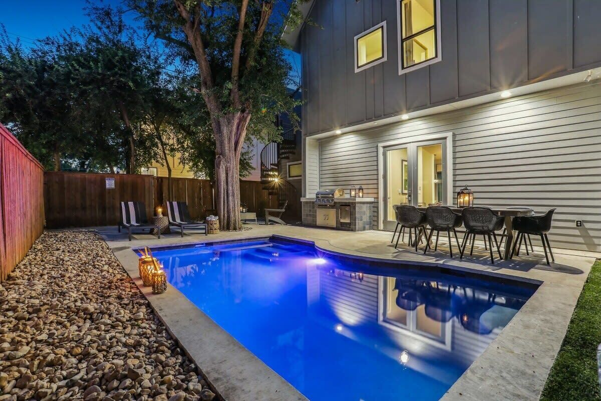 This contemporary duplex in East Austin can fit up to 17 guests with its 7 bedrooms, 4 bathrooms, and minutes from downtown Austin. With its ample amenities, including a shared outdoor area and a pool, this home is great for those exploring Austin. The professionally designed spaces offer open-concept layouts and kitchen & dining spaces perfect for entertaining.