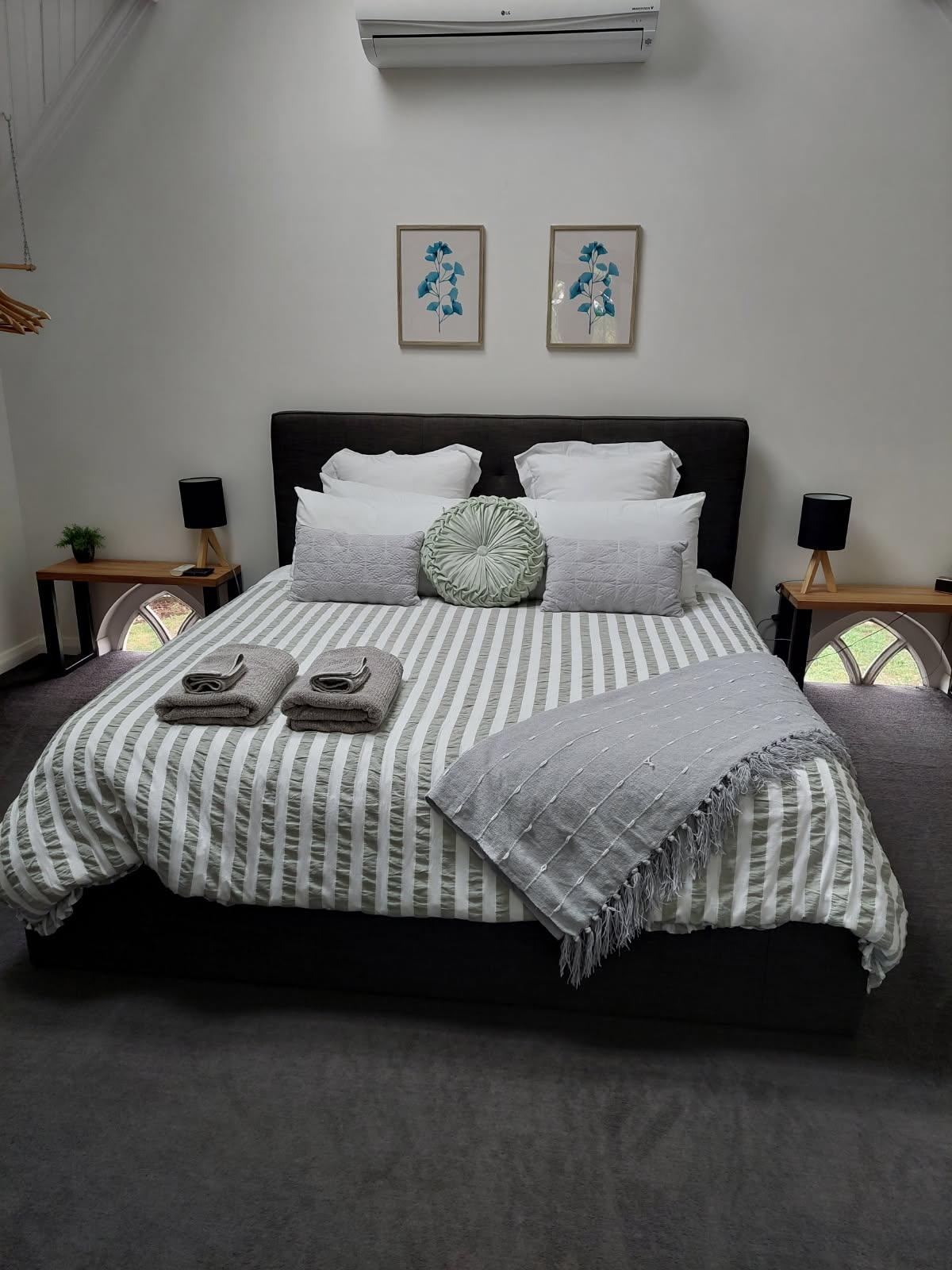 The second bedroom has two King single beds and the option for a third pull out single bed available on request. Complete with the views of the church windows, exposed beams and brick wall you will appreciate the history of this beautiful building.
