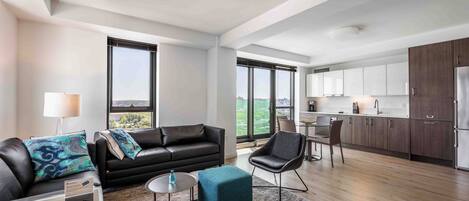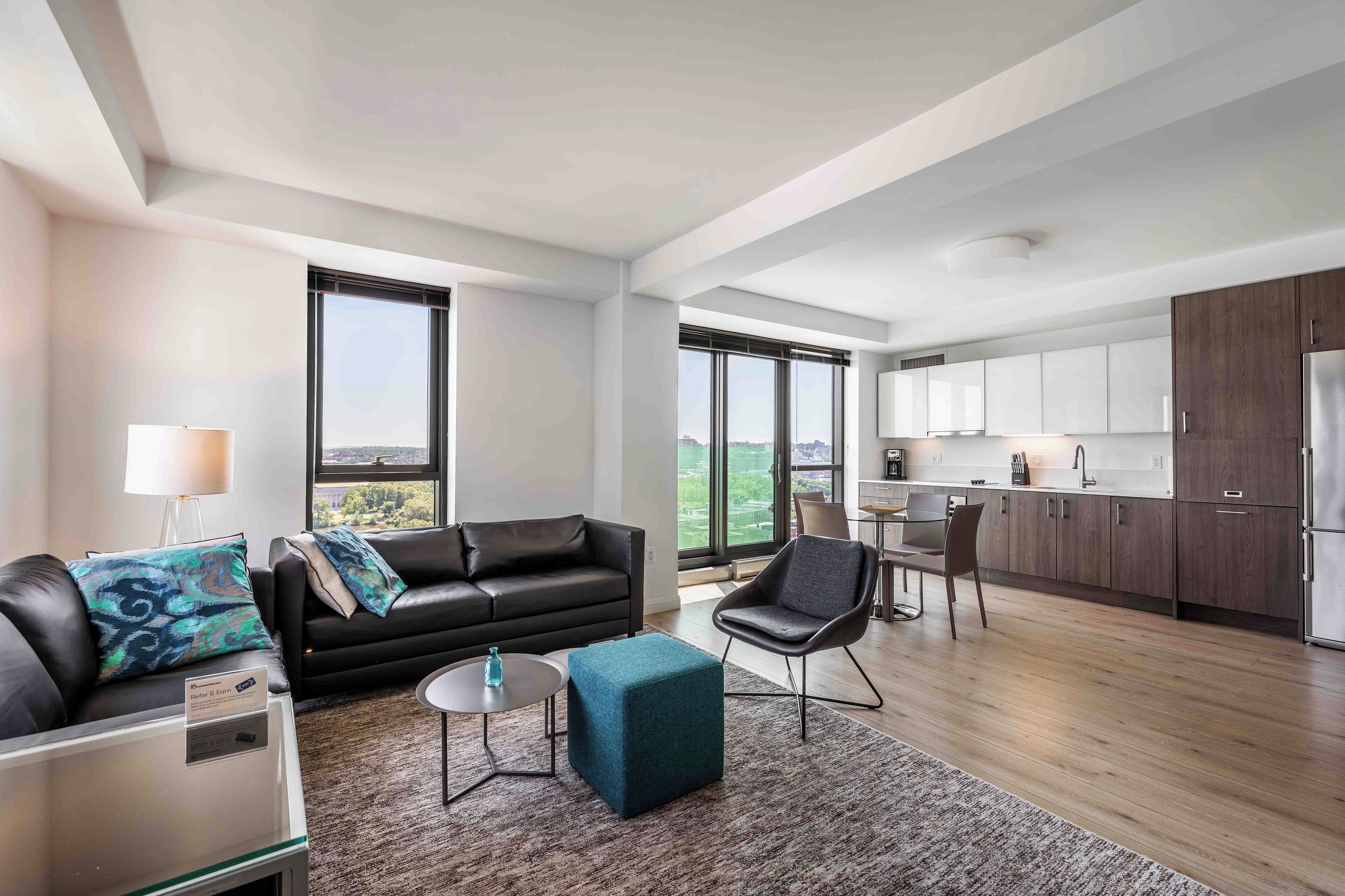 Enjoy the cultural capital of Boston, the Fenway Cultural District, while staying in this gorgeous two-bedroom apartment with floor-to-ceiling windows, high ceilings, German-engineered stainless steel appliances, white quartz countertops, European-style frameless kitchen cabinets with generous storage, smartphone-controlled lighting options, spa-inspired bathrooms, wide-plank flooring, wall-to-wall carpeting in the bedrooms and a front-loading washer and dryer in the apartment. All beds provided are, fitted with plush linens and pillows. All Furnished Quarters apartments include 24/7 guest service. Pets are allowed in select apartments and are subject to a $500 non-refundable pet sanitation fee for one pet, $750 for two pets. Additional charges and size/breed restrictions may apply and vary by building. All pets must be approved by Furnished Quarters. Please let us know ahead of booking if you plan on traveling with a pet.