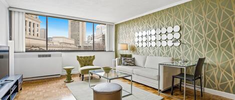 This spacious one-bedroom apartment features high ceilings, floor-to-ceiling windows, oversized walk-in closets and an in-unit washer/dryer. The pristine kitchen with Italian-inspired finishes has quartz countertops, stainless appliances and a gas stove. Extras include a 48-inch smart TV, stereo, Keurig coffee maker and upgraded Cuisinart housewares.The bed provided is queen size.All Furnished Quarters apartments include 24/7 guest service. Pets are allowed in select apartments and are subject to a $500 non-refundable pet sanitation fee for one pet, $750 for two pets. Additional charges and size/breed restrictions may apply and vary by building. All pets must be approved by Furnished Quarters. Please let us know ahead of booking if you plan on traveling with a pet.