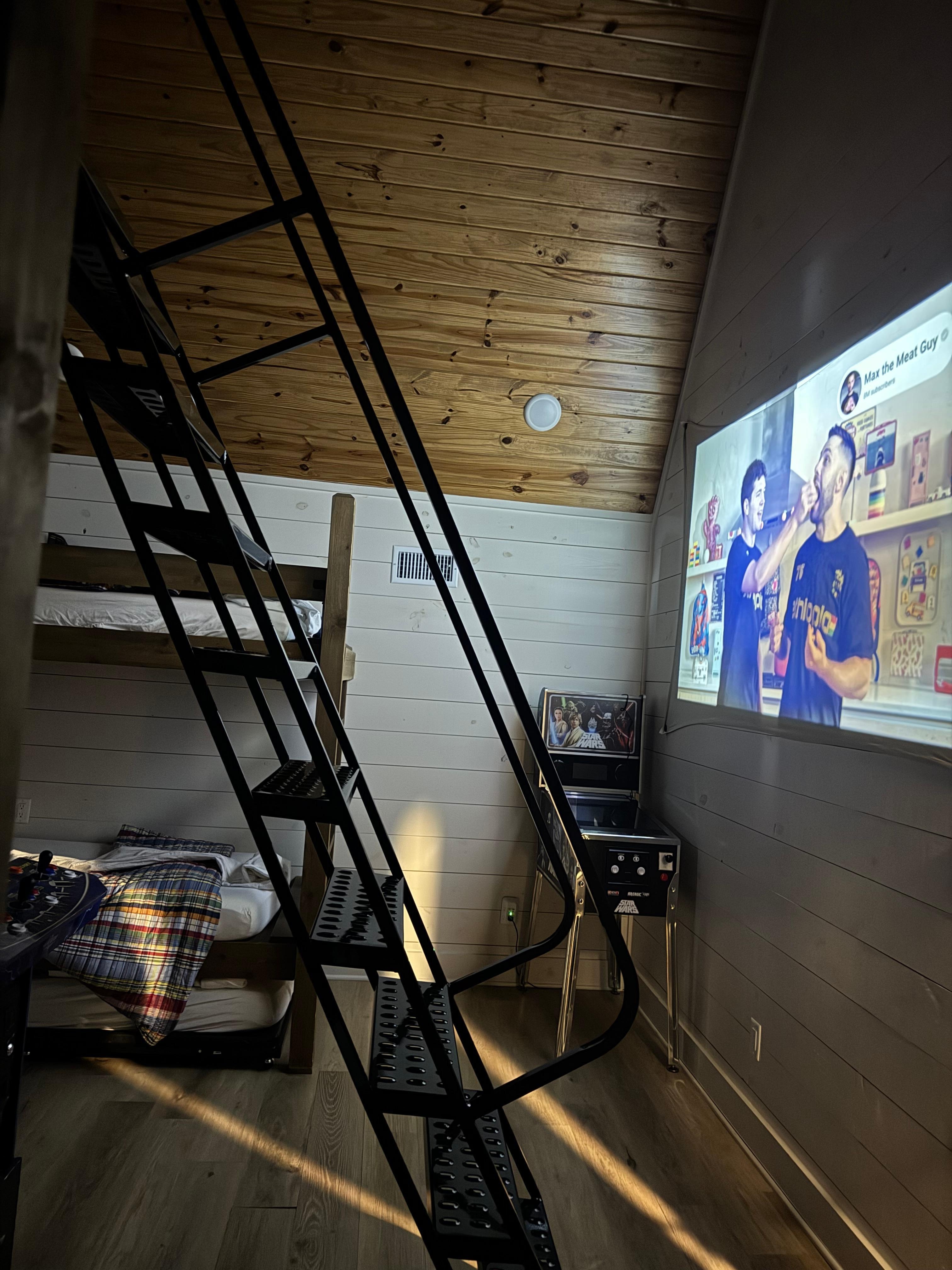 Upstairs on the second floor, you’ll find the 3rd bedroom, complete with 4 custom built-in bunk beds with trundle beds. Sit back and relax on one of the two oversized bean bags, while enjoying your favorite show or movie on the 100" indoor projector screen. It’s a great space for kids to hang out with a few board games, especially while listening to the pitter-patter of raindrops on a rainy day. But no kid will get bored when there are 7 arcades to pick from and play for hours. 5 arcades in the game room with a Star Wars digital arcade pinball machine as well as even a 2-person arcade in the top loft area. This fun area is a MUST SEE.