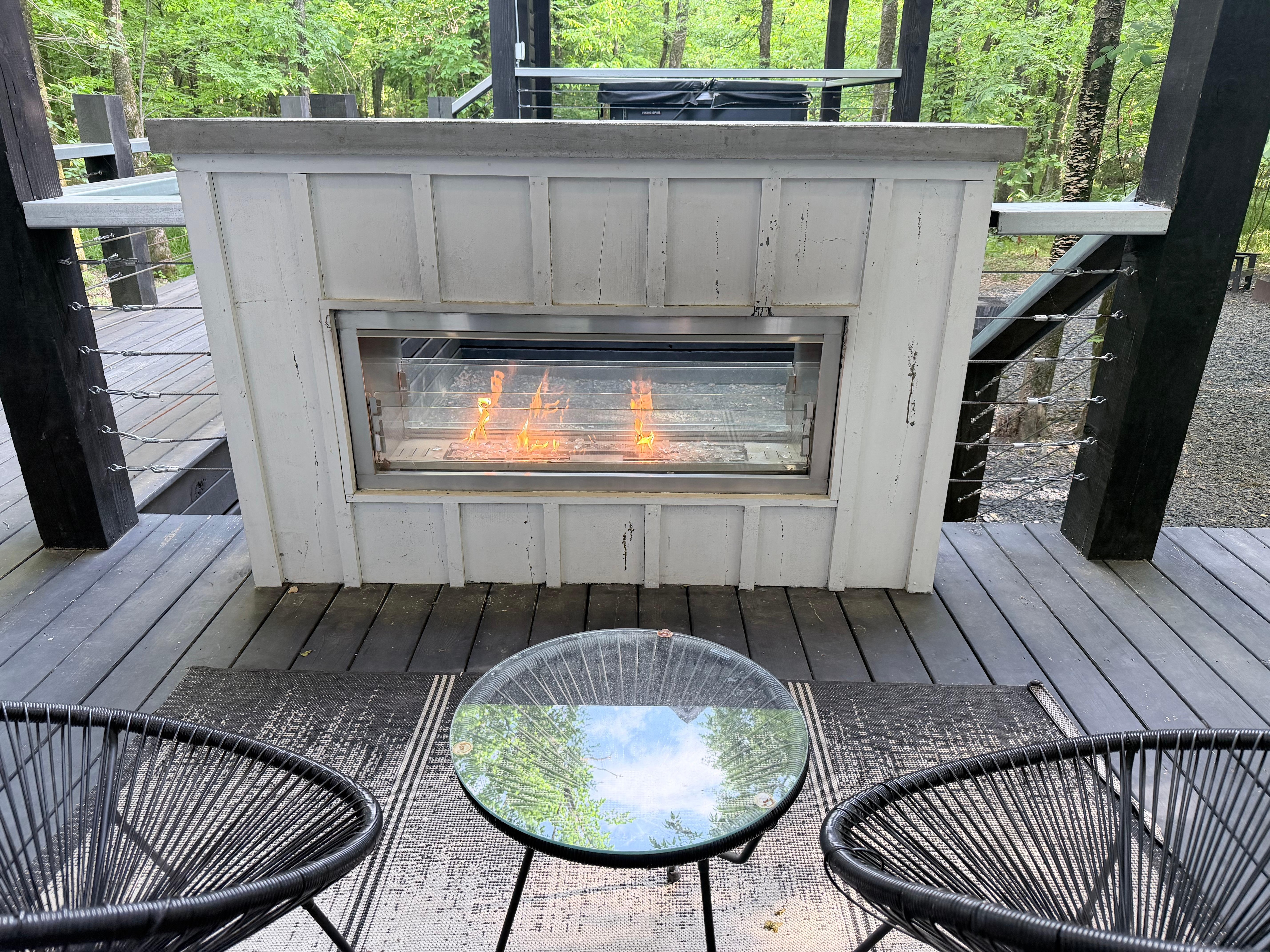 Custom swing bed + electric fireplace on the back deck