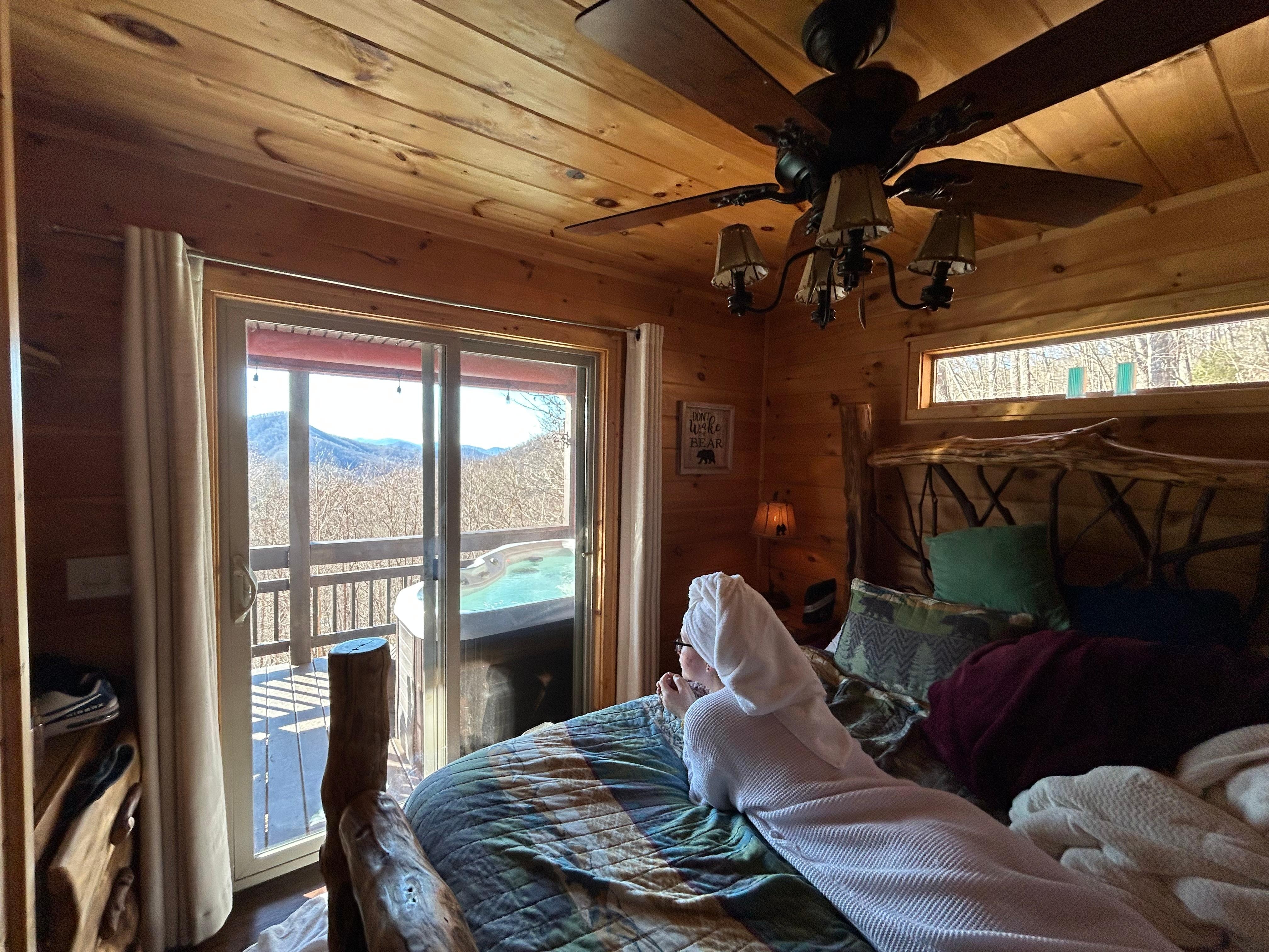 • Queen bedroom suite with plush bedding and private access to the hot tub