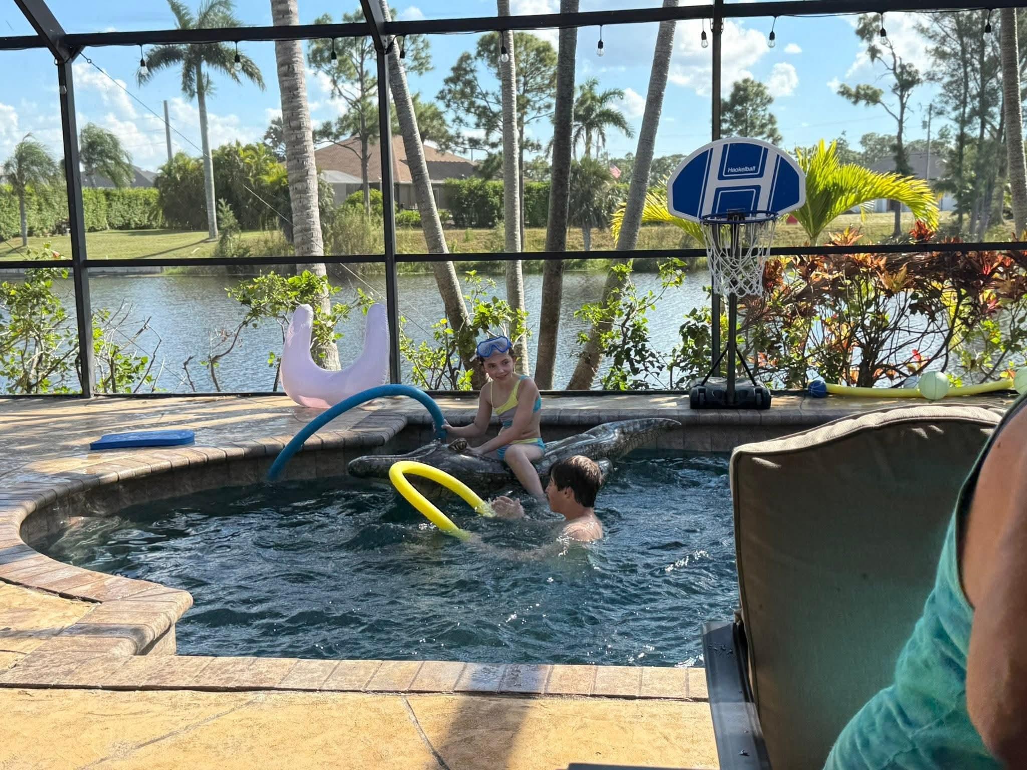 If you go out the massive sliding patio doors to the south facing screened lanai, you’ll find the outdoor dining set, patio sectional sofa, fire table, smart TV, golf putting game, three loungers and tons of pool games/toys! The saltwater, heated pool ranges from 4’-6’deep with a sitting bench and stairs. Pool is set to 82 degrees from 9-4 everyday, if you'd like it warmer its a $35/day charge. The spa has circular seating with jets and views of either the smart TV, or the canal. Have safe fun using our plastic drinkware, please no glass.