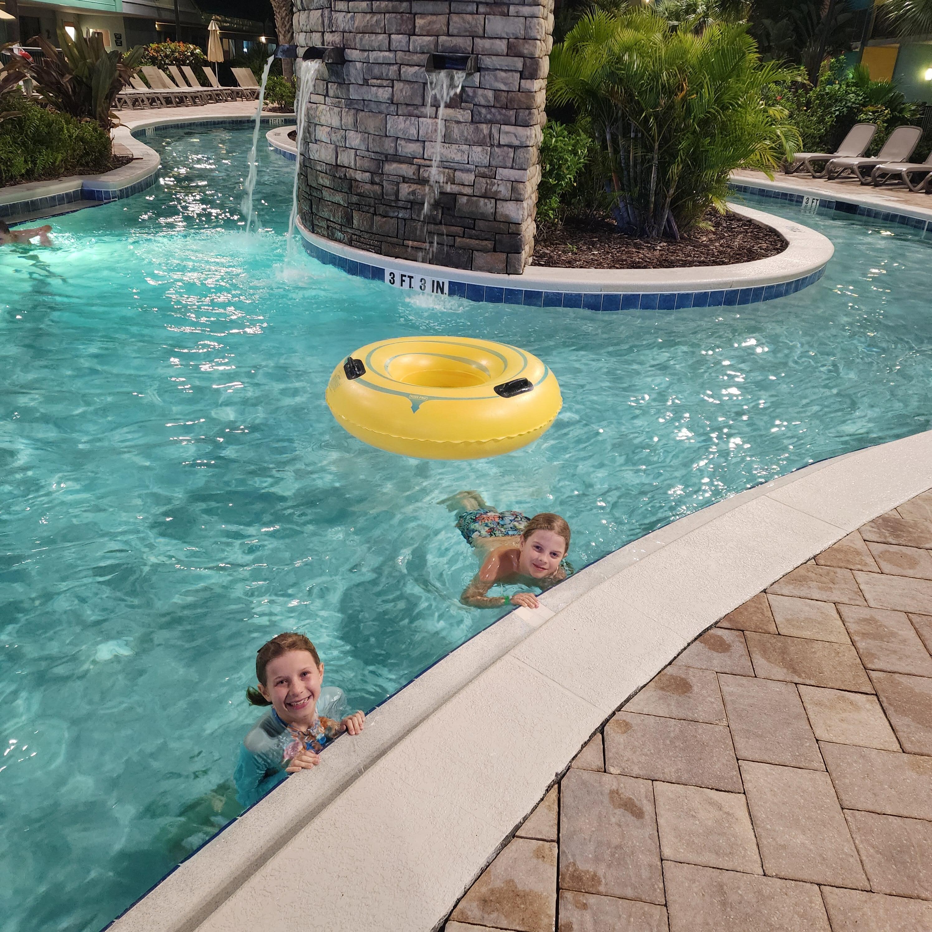Great spot for families. 2 minute walk to the beach, free beach equipment can be signed out (chairs, umbrellas, boogie/surfboards, bicycles). Very friendly staff, games for kids (connect 4, bean bag toss, board games in lobby), movie shown on big screen saturday night, live dj saturday afternoon, lazy river with tubes.