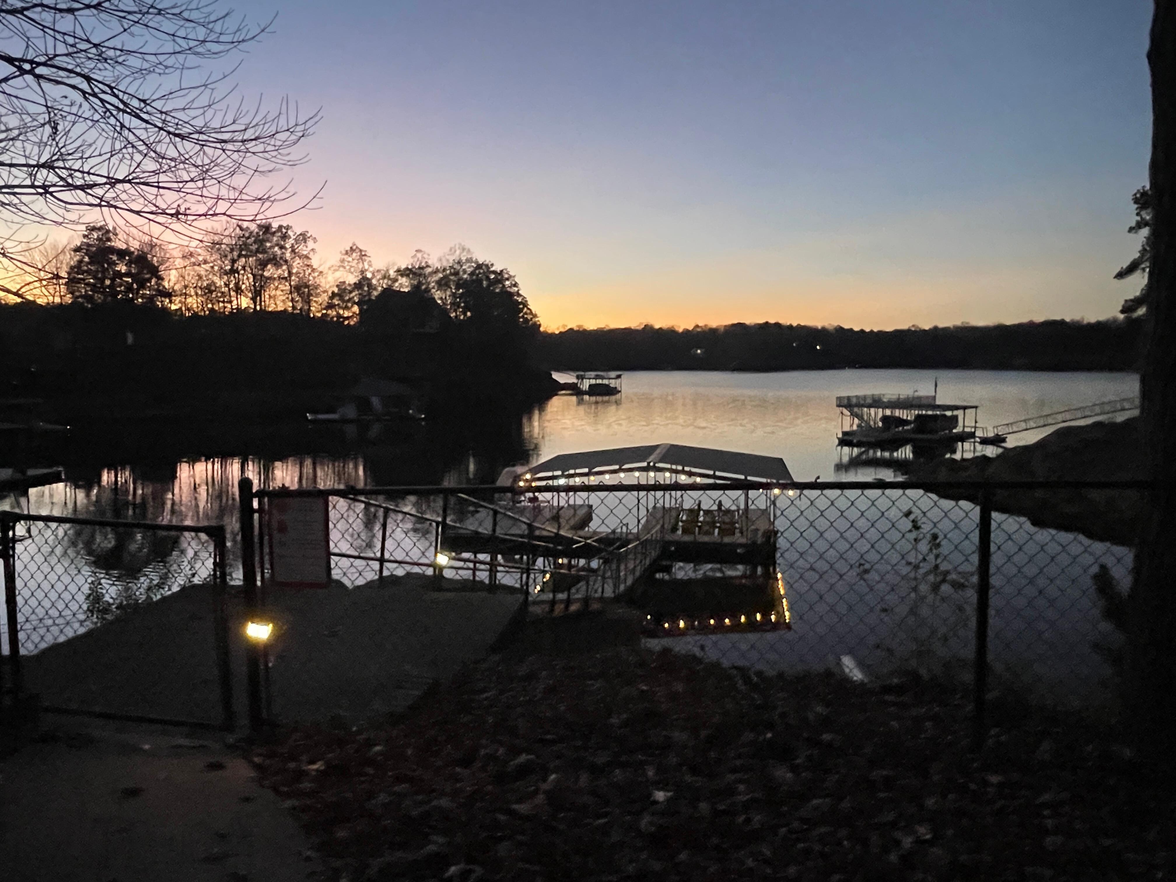 A concrete sidewalk leads you through the gate to a mostly flat walkway, this does fluctuate slightly based on lake levels during the year, but you’re only a few steps to the large 2 slip boat dock with a huge extended swim platform and yes…. A Slide!!