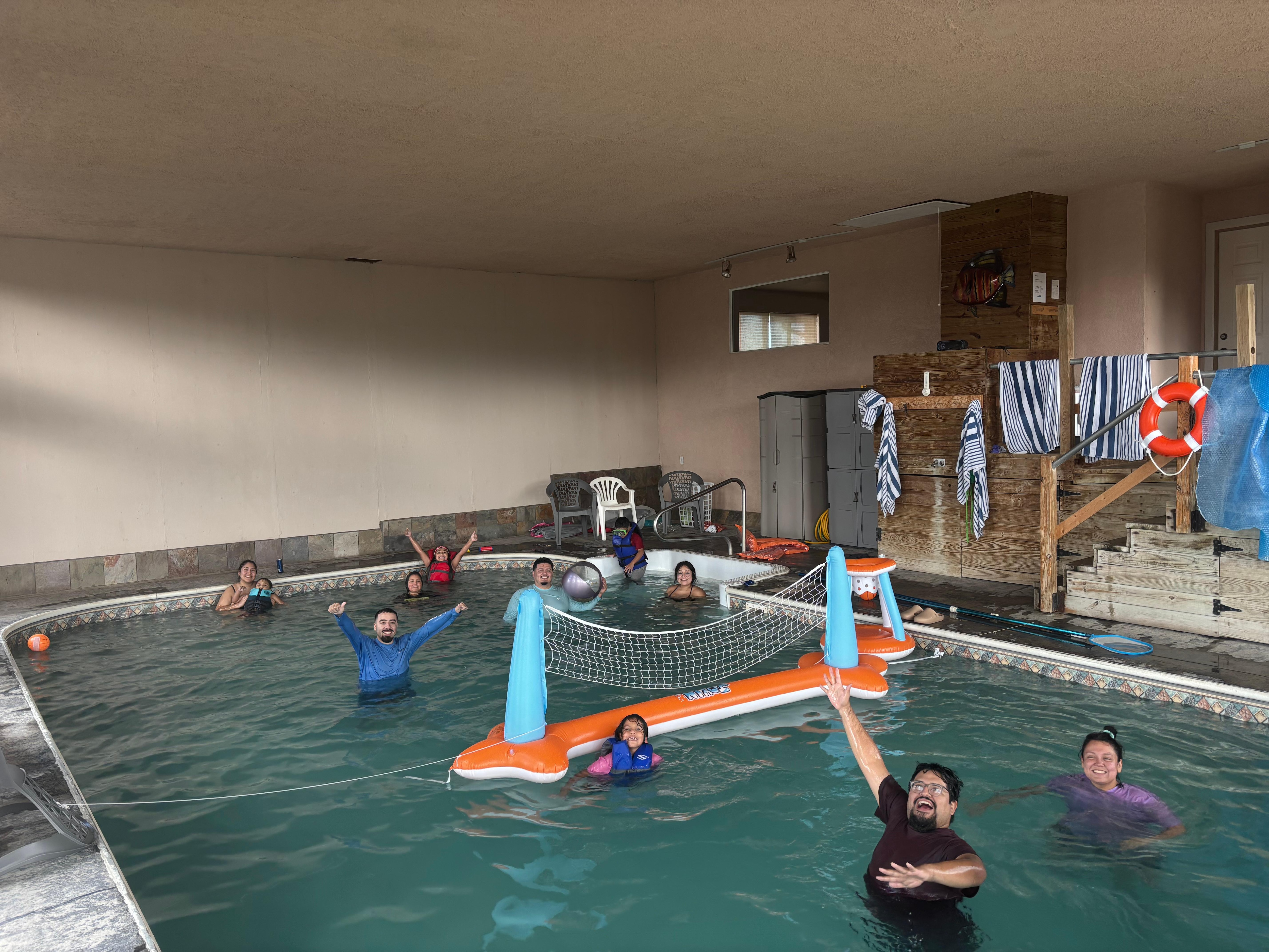 The gourmet kitchen is a chef's dream, equipped with two ovens, a gas stove, and a large bar, making it easy to prepare meals for a crowd. Enjoy indoor and outdoor dining with plenty of tables and chairs, or take a moment to soak up the cool sunshine on the expansive deck. For those seeking relaxation, the indoor heated pool is a hit with the younger crowd, while adults can indulge in the hot tub or sauna.