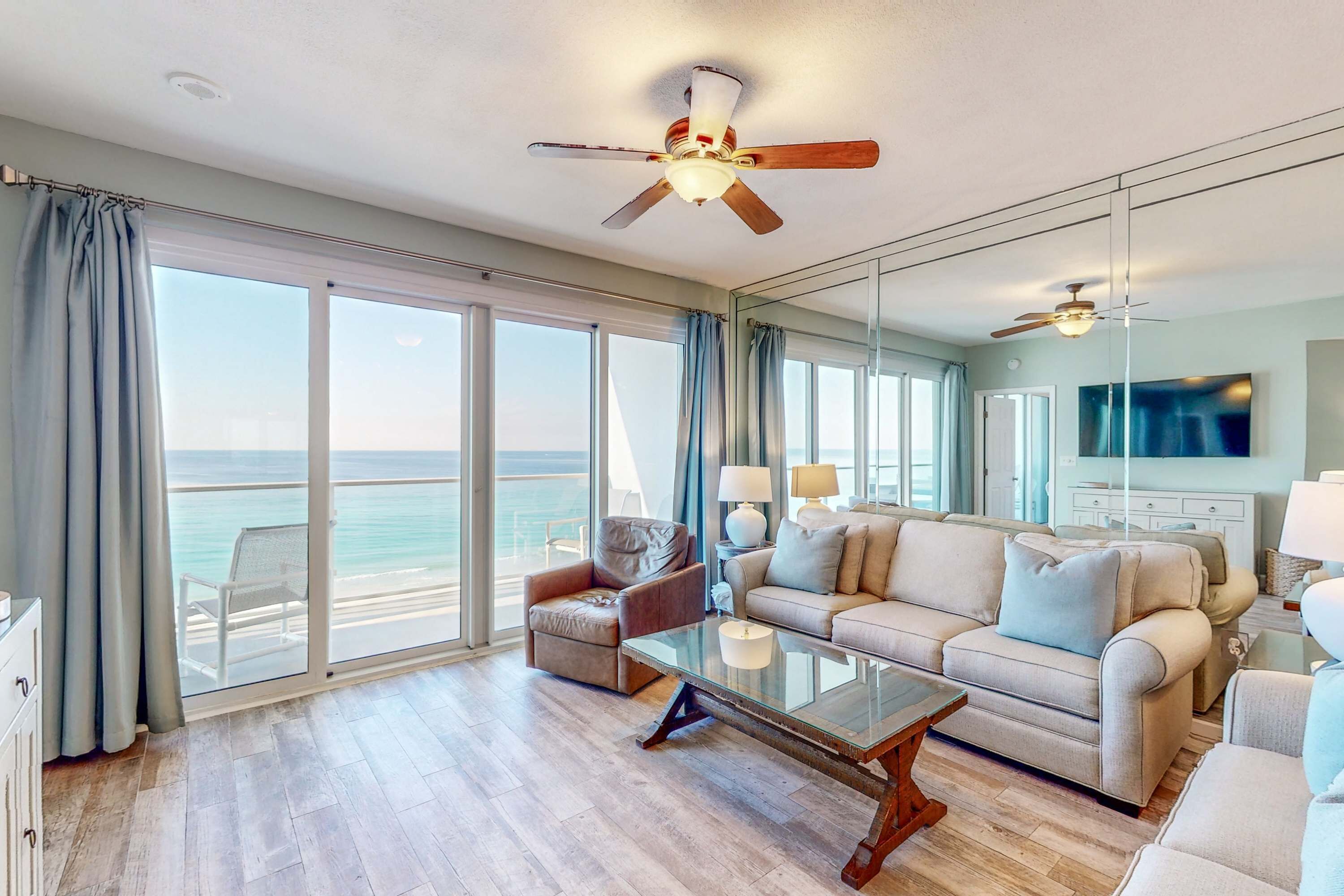 The master bedroom has incredible beach views and private access to the beach-facing balcony. Complete with a king bed, flat-screen TV, and private ensuite bathroom, the master bedroom was designed with relaxation in mind. The master bathroom features a jacuzzi tub, walk-in shower, and double vanity. The guest bedroom has a king bed, flat-screen TV, and private access to the beach-facing balcony. Just steps from both the guest bedroom and the living area is a full bathroom with a walk-in shower.
