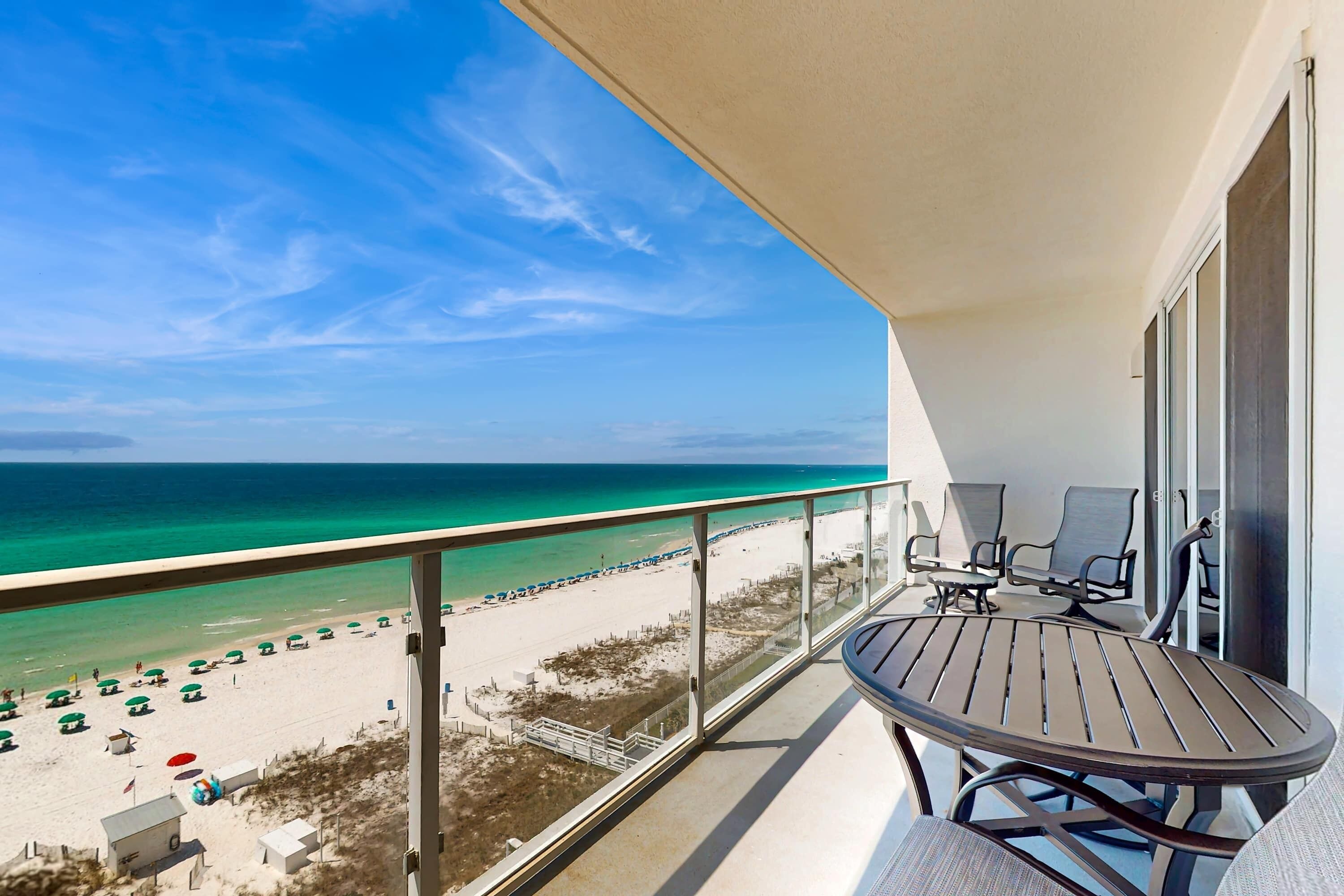 The interior spaces of Silver Shells St. Lucia 804 have been tastefully decorated with a trendy coastal theme. An open floor plan gives the whole family or group space to relax together. The living area is beach-facing, features floor-to-ceiling windows and sliding glass doors, and offers plenty of seating for everyone to gather around the flat-screen TV. The couch even converts to a queen sleeper sofa for larger parties. The spacious beach-facing balcony is perfectly furnished to allow for entertaining or dining while taking in spectacular views of the white sand beach and emerald waters. The dining area has seating for four with three additional seats at the breakfast bar. The fully equipped kitchen includes full-size appliances and all the cookware and dishware you could need for creating memorable meals.