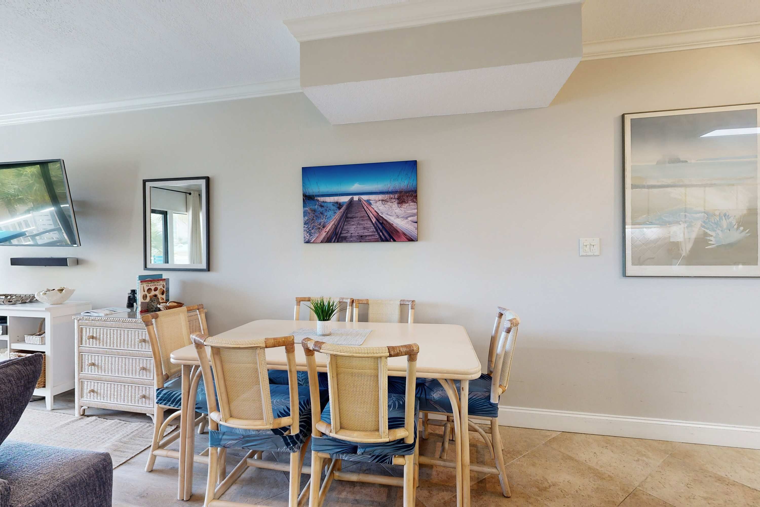 Two bedrooms, both with private baths. Master has a king bed and guest bedroom has 2 twin beds. Both bedrooms have private baths. Master bedroom has a tub/shower. Guest bedroom has a walk in shower. Both bedrooms have flat screen tvs. As well as a flat screen tv in the living area. Master bedroom has sliding screen doors to the balcony. Sleep to the sounds of the ocean! The updated kitchen is fully equipped. Just bring the chef! The dining area seats 6 and the two bar stools add two more quests. The loving area is quite spacious with floor length mirrors to enhance the view! the pull out couch has a queen mattress. All the comforts of home!