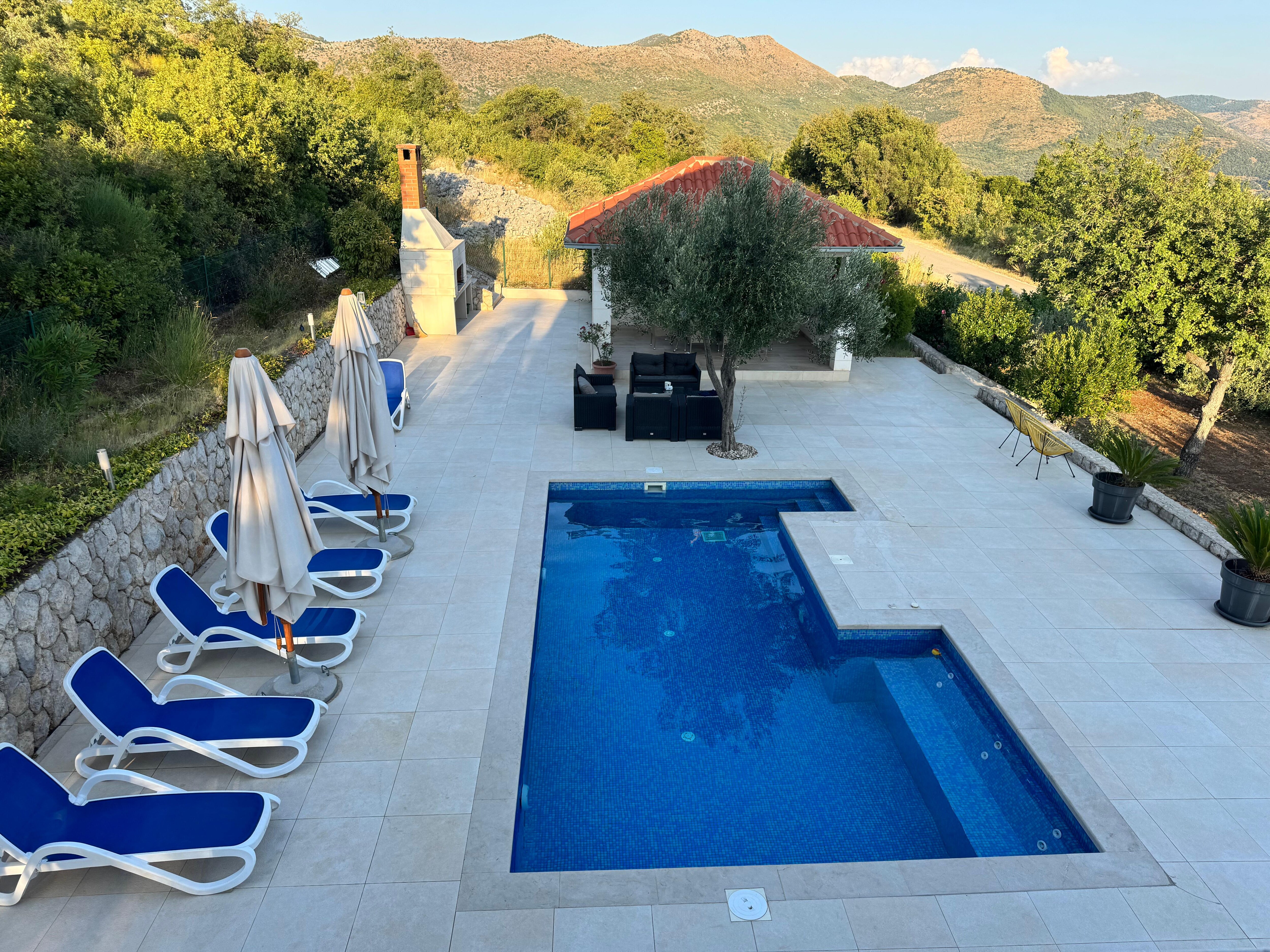 Outside dining area with BBQ is a perfect spot to enjoy evening meals in the tranquil area around the estate. A car is necessary for this property as shops, restaurants and bus stop are not within walking distance. The property comes together with 3 free parking spaces. Grocery shops in Orasac are within a few minute driving distance. Sun Gardens Dubrovnik complex is 5 minute drive from the villa.