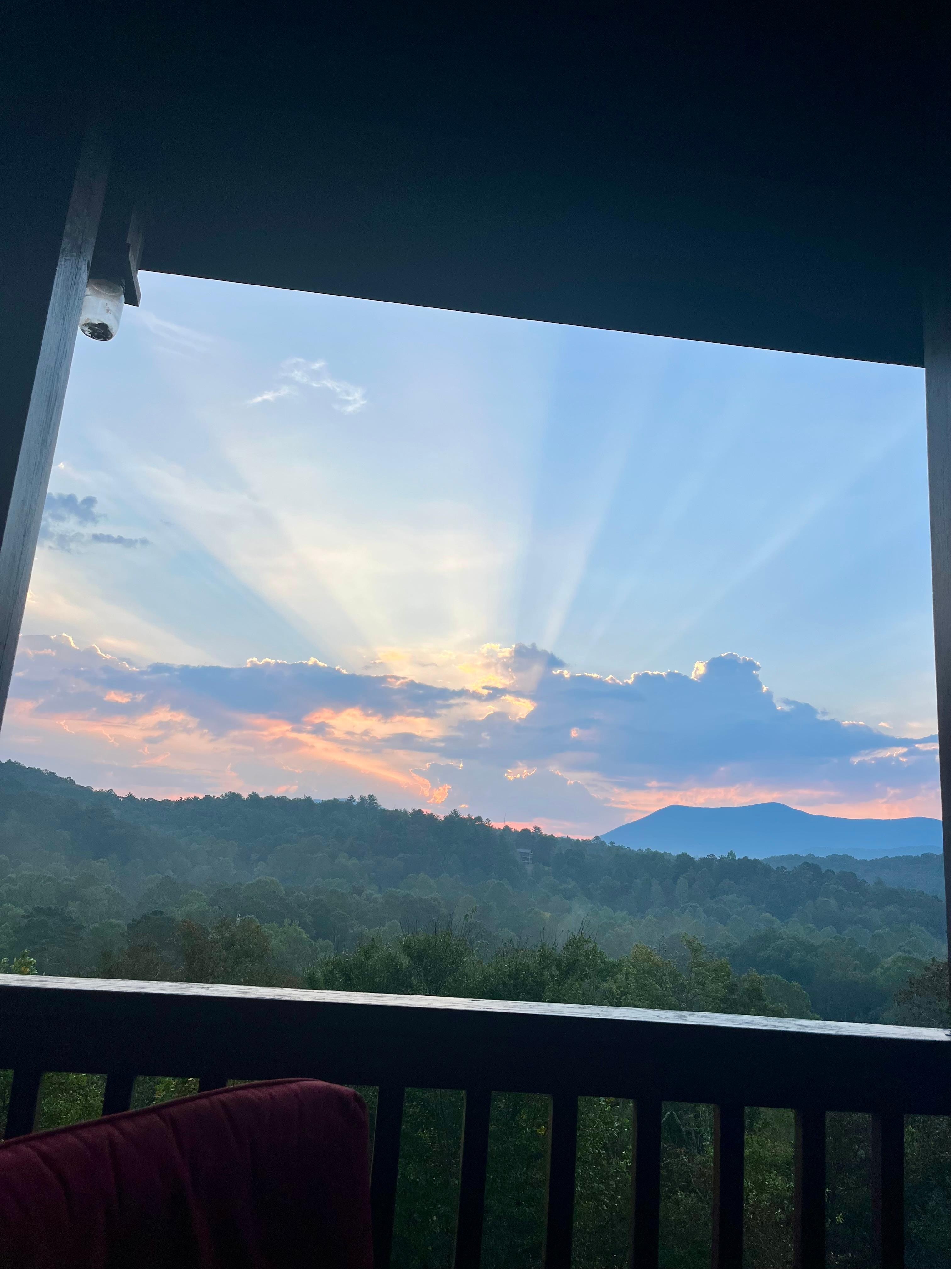 Apple Bear Ridge has two brand new luxury king size beds in nice size bedrooms with their own baths. 3 HDTVs with cable, free WIFI and Netflix! Enjoy a glass of wine with friends or your special one around the propane fire pit on the porch overlooking those amazing views!No smoke or being bothered by rain, so sit chat and relax!