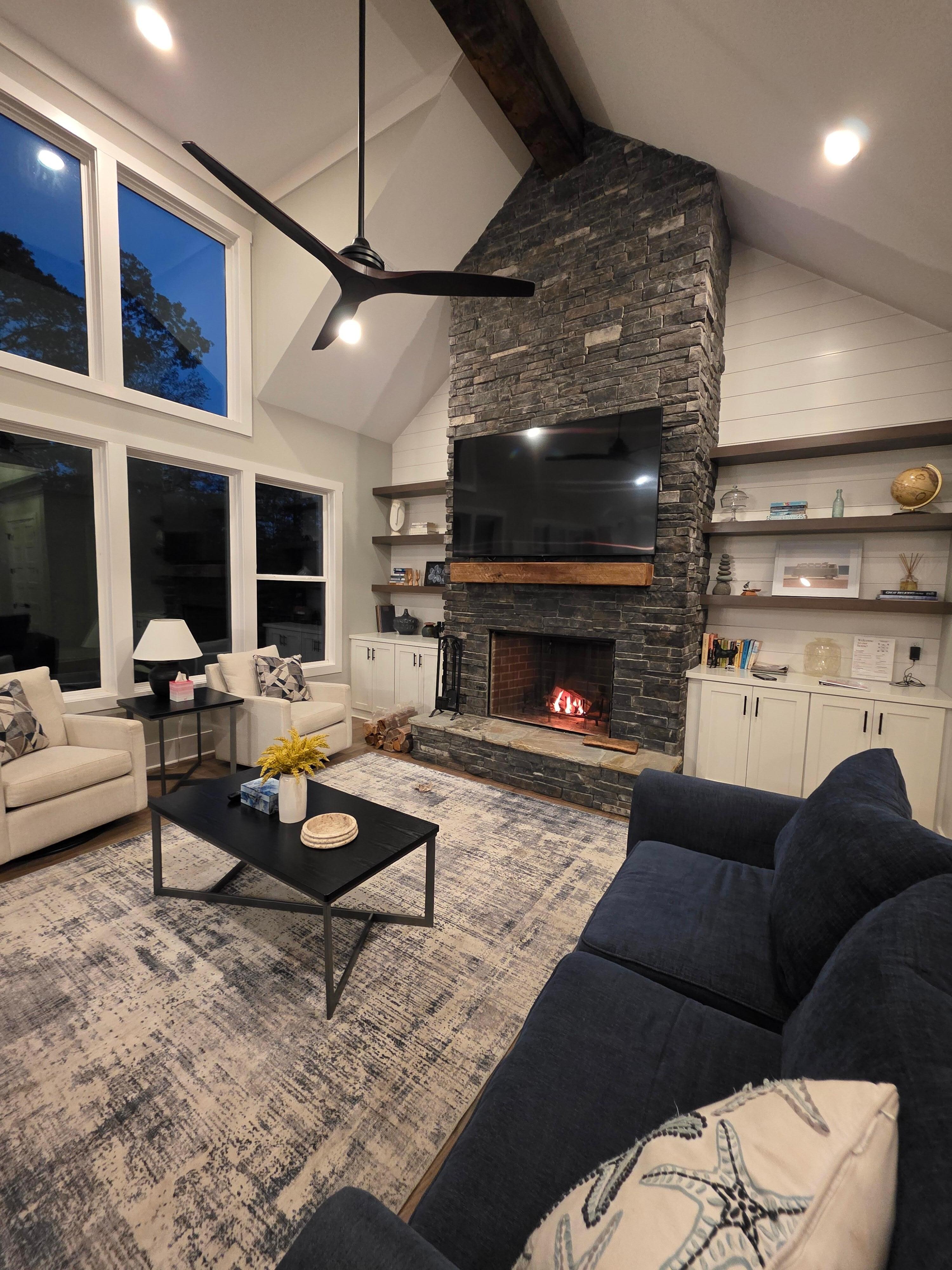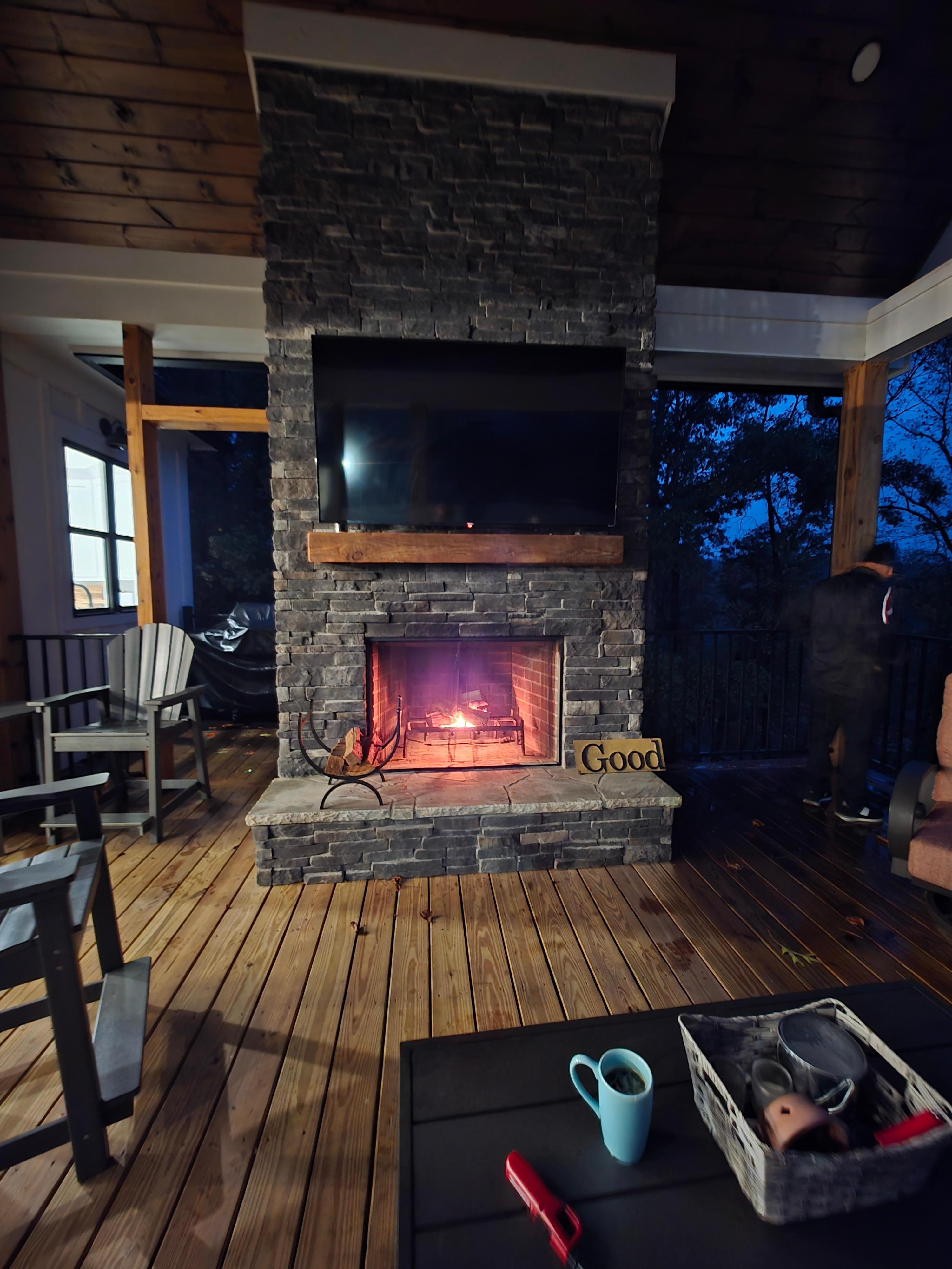 The outside deck is made for family enjoyment! From the comfortable seating areas, wood fireplace, and wide-screen television this porch is for hanging out for coffee in the morning and wine in the evening!