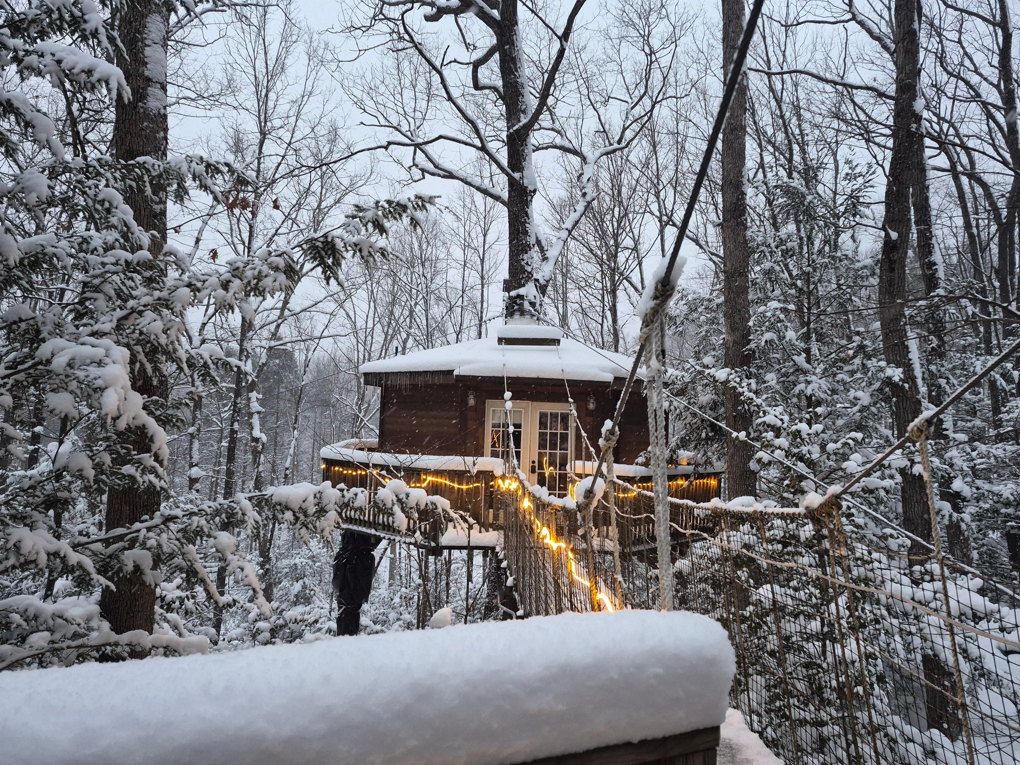 Measuring 24 feet in diameter including outside wrap around 3-foot deck area leading to viewing balcony. Our custom designed deluxe Holly Rock Treehouse is a sturdy, wooden structure with double French door entry, accessed from the hillside by a canopy bridge and includes expansive indoor window design to take in the bird’s eye view of the beautiful Appalachian Forest! The Treehouse boasts a queen bed, small dining area, and decks in the treetops! This cabin is built for two and to make memories for a lifetime! Let us know if you are celebrating a honeymoon, anniversary or birthday and we will add a special surprise for you to enjoy!
