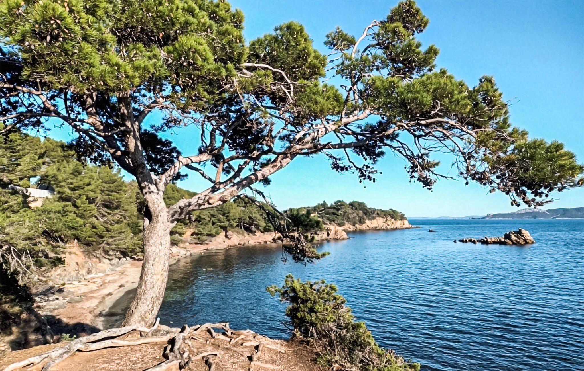 The bright and perfectly laid-out flat consists of a fully equipped open-plan kitchen, a cosy living room with a comfortable sofa bed (160x200) and direct access to a superb terrace with breathtaking views of the sea and Porquerolles — the ideal place for al fresco dining or relaxing while enjoying the panorama.