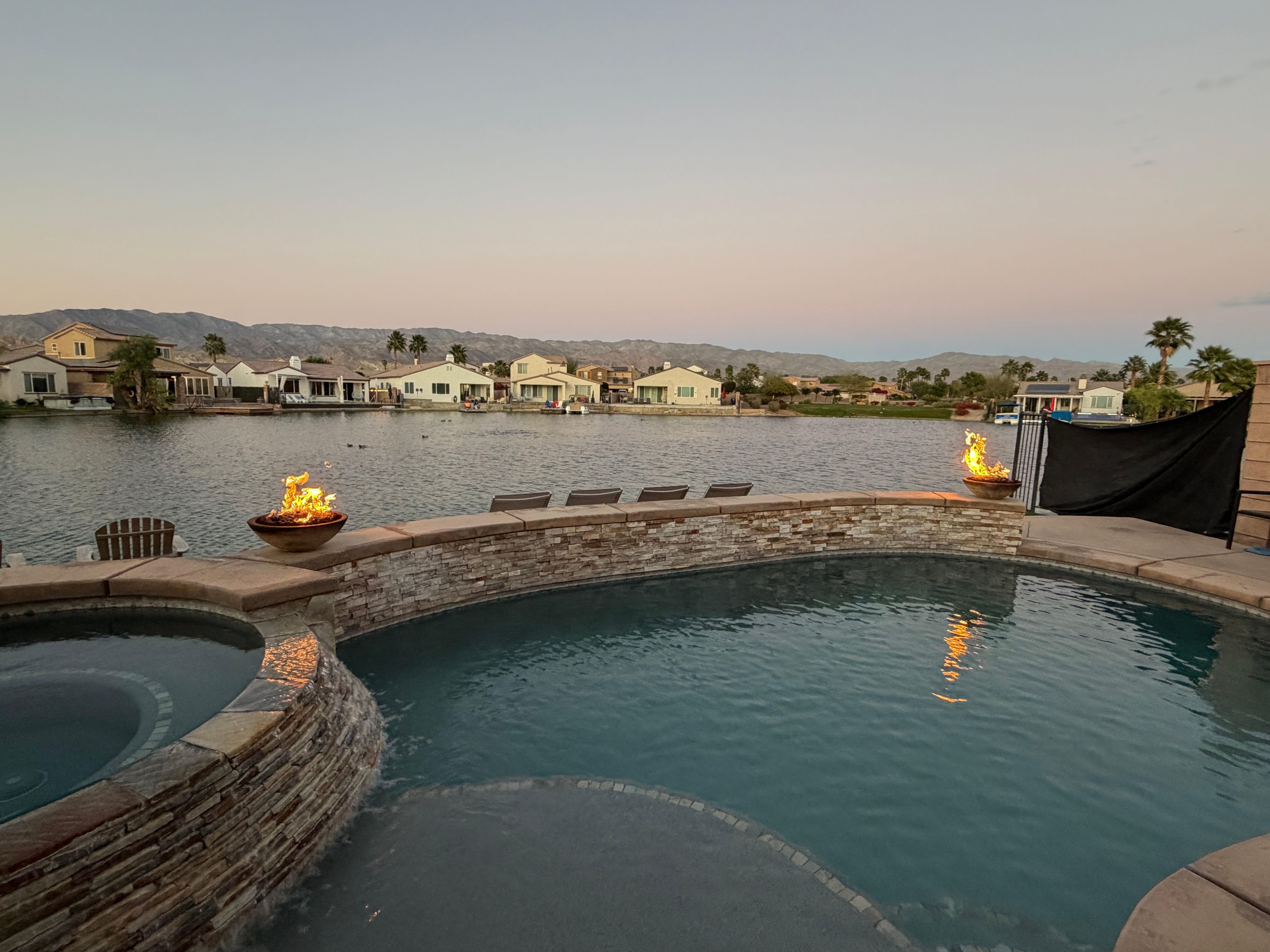 - Gorgeous pool and spa, BBQ, fire pit, fire bowls, bar, corn hole area, and party lights, all with stunning lake and mountain views.