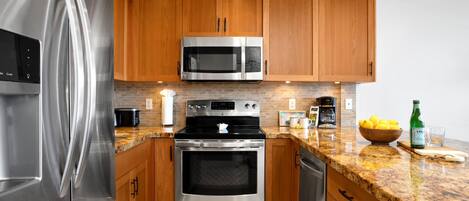 Suite 1002 is a beautifully upgraded 2BR/2BA corner residence featuring a spacious layout with a king bed in the primary bedroom, two full-size beds in the guest bedroom, and two luxurious bathrooms with 8-foot glass-enclosed walk-in showers. The gourmet kitchen includes granite countertops, stainless steel appliances, and custom cabinetry, ideal for preparing meals and entertaining.