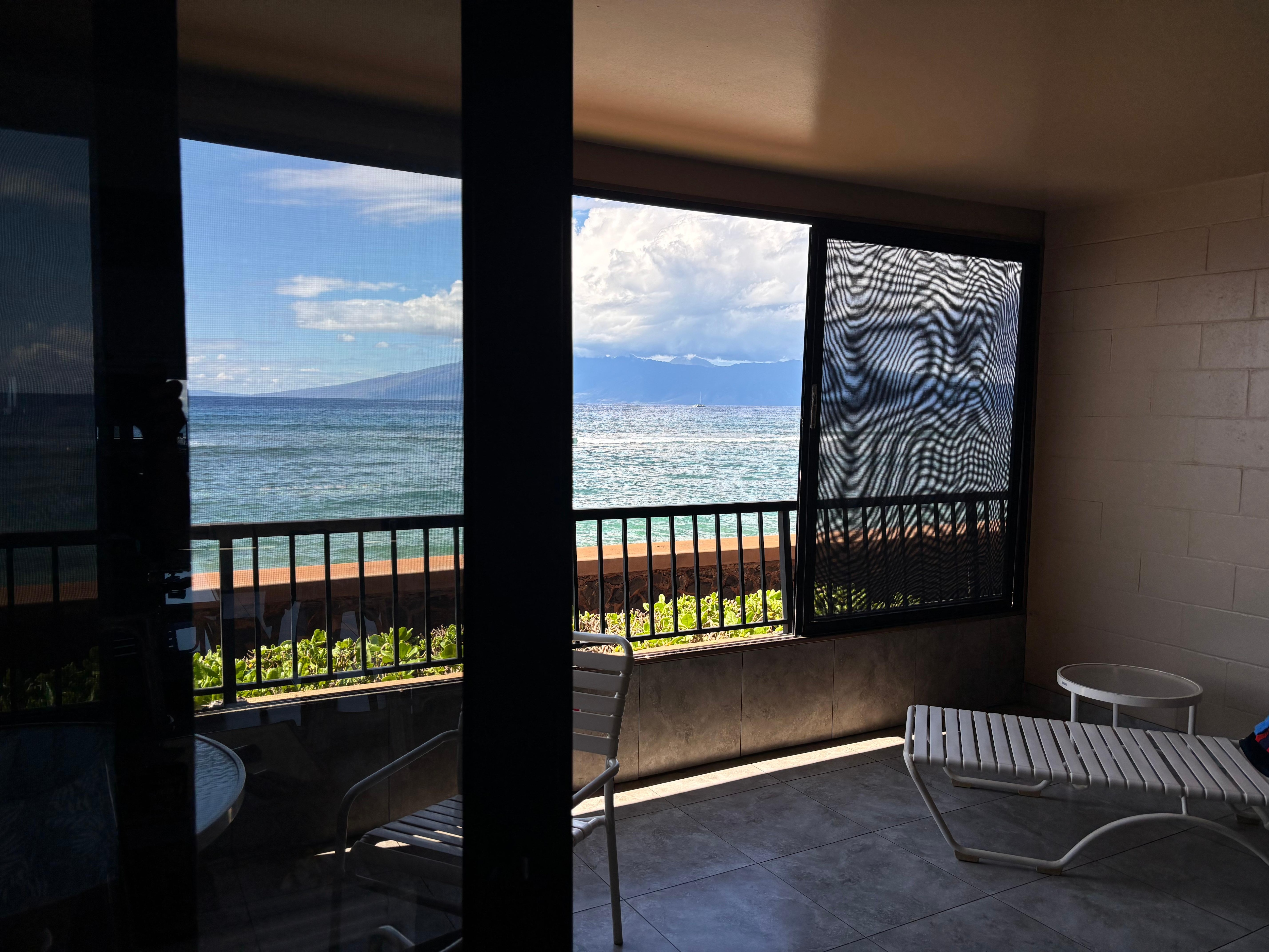 We walked into this beautifully remodeled oceanfront condo, and were delighted. The view is world class; unobstructed views of Molokai and Lanai, with a front row seat to countless humpback whales in the Channel! The condo is well-stocked with all the essentials, including A/C, and a large screen TV. We were very comfortable, and enjoyed the pool and hot tub. We highly recommend Unit 105, at the Maui Kai!