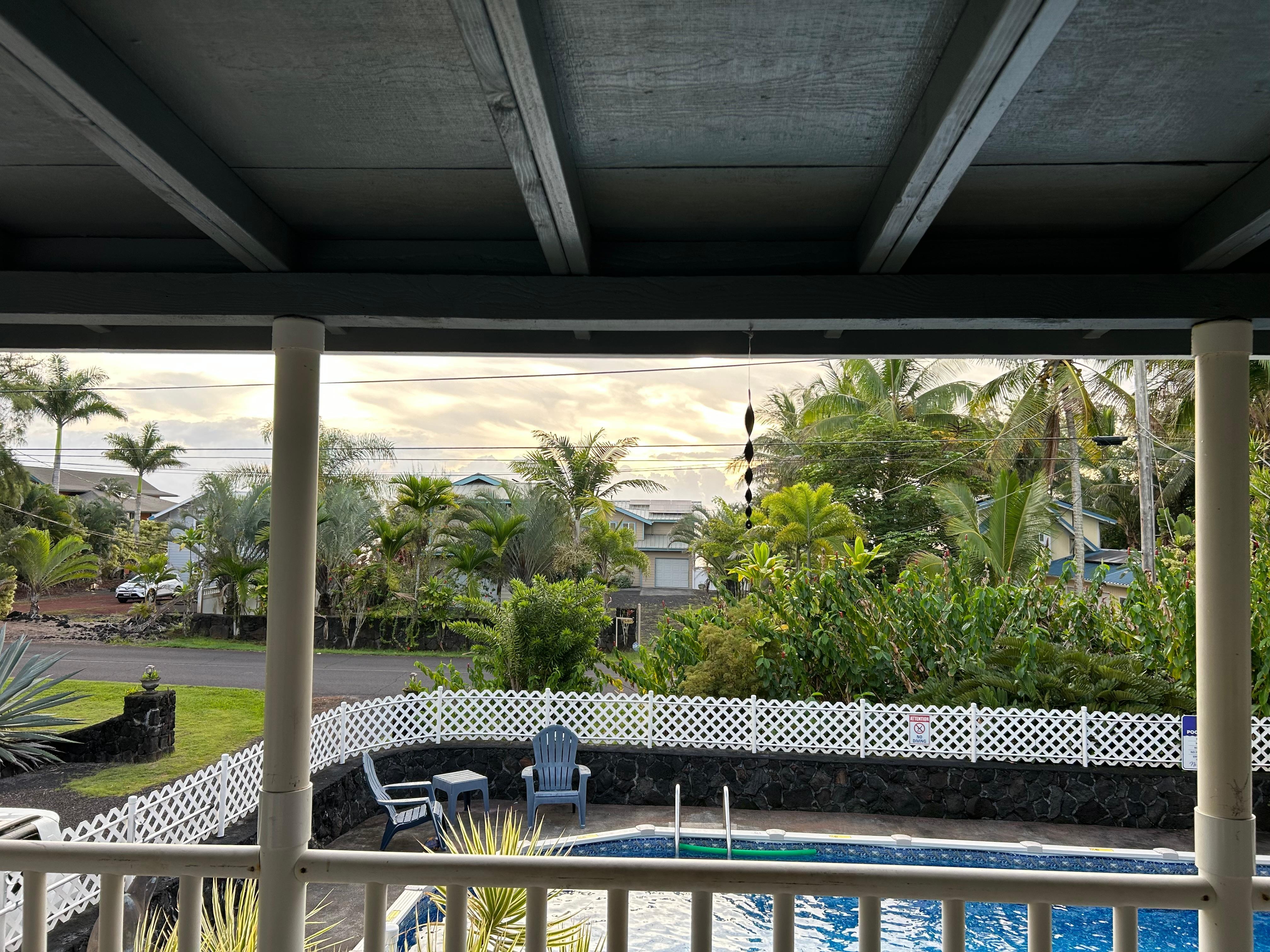 Kaloli Sunrise by the Sea sits just across the road from the big blue Pacific Ocean in a charming neighborhood on Hawaii's Big Island. Enjoy the wrap around, upper lanai with views of tropical landscaping and our private swimming pool. Dip into the pool anytime and cool down after travel adventures around the inspiring island. Fall asleep to the sound of the ocean, just across the street.