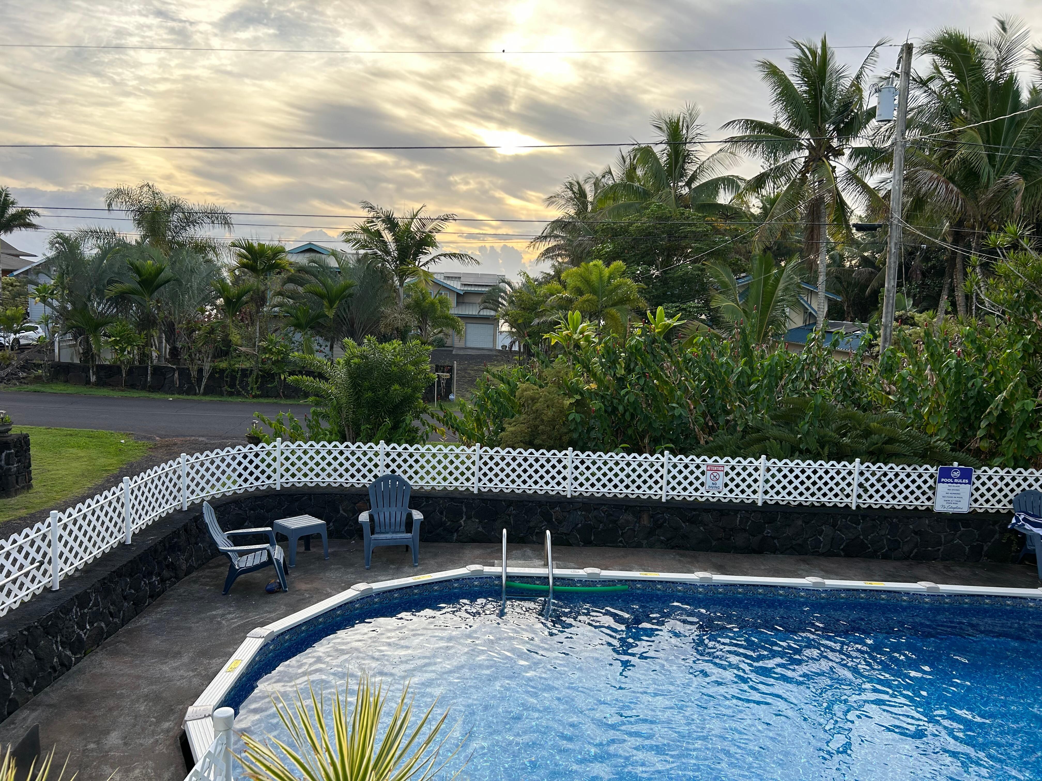 The swimming pool is above ground with a surrounding deck with a few lounge chairs. We provide pool towels. The upper lanai also has two dining tables with chairs so you can sit and dine overlooking the pool OR the backyard landscape. We provide a binder in the house with loads of local recommendations, adventure hikes, restaurants, and favorite things to do. We hope you enjoy Kaloli Sunrise by the Sea as much as we do!