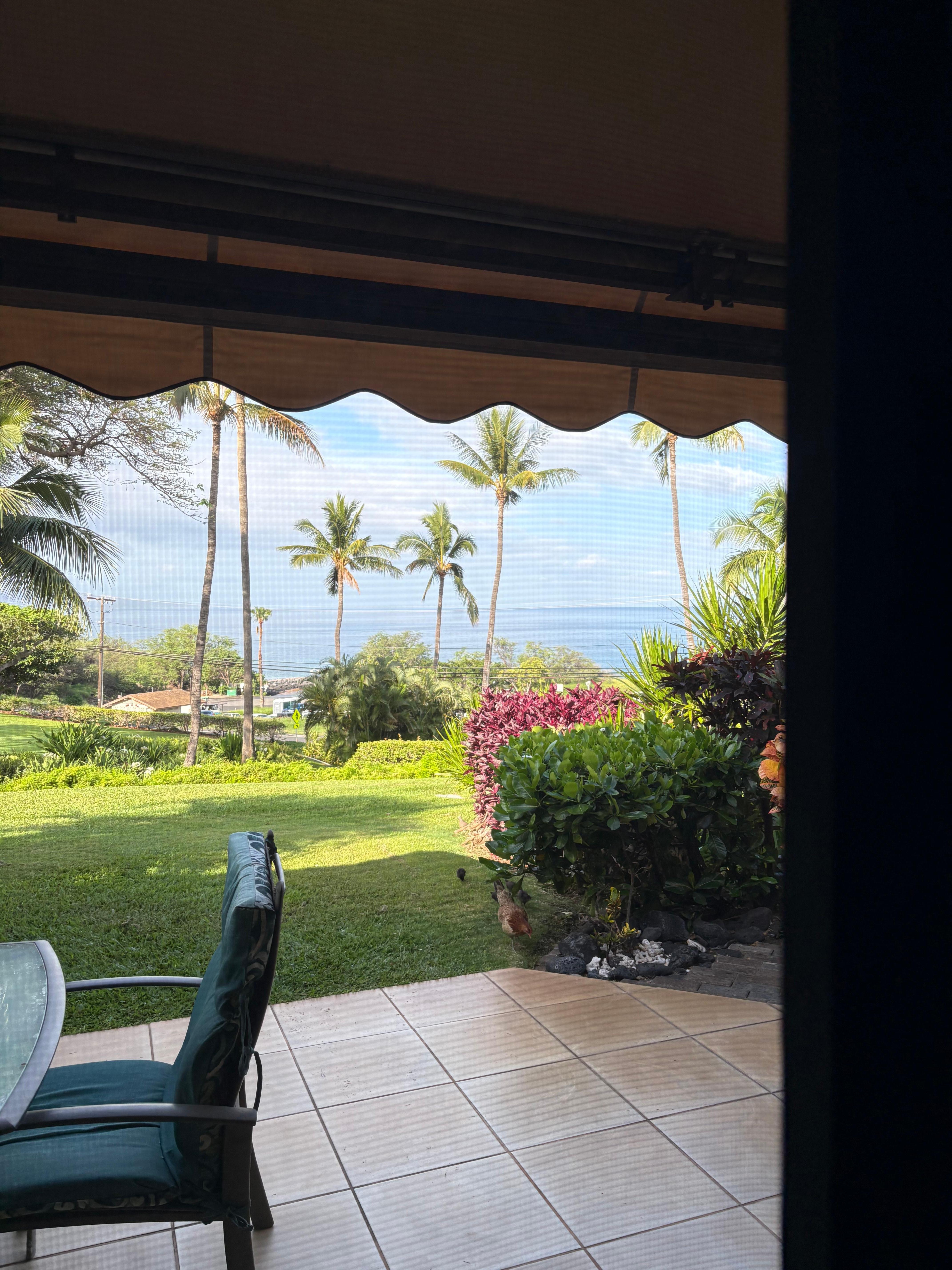 Why come to Maui and not be able to see the ocean? Enjoy dining from my lanai looking right at the ocean! My one bedroom condo in the Ginger complex (G-104) is your paradise! Over 20' wide living room, 1039 sq. ft. 2 baths, large master bedroom with a king bedroom set. The spacious living/dining/kitchen area includes an adjustable large flat screen TV (you could even watch it from the lanai or kitchen or bed), ceiling fans, and desk (free internet). The queen daybed is perfect for reading, an afternoon nap, or your company to enjoy (no uncomfortable hid-a-bed in my condo). The master bedroom is also quite spacious with another flat screen TV and DVD player, and a courtyard for hanging wet clothes, storing toys, boogie boards, etc.