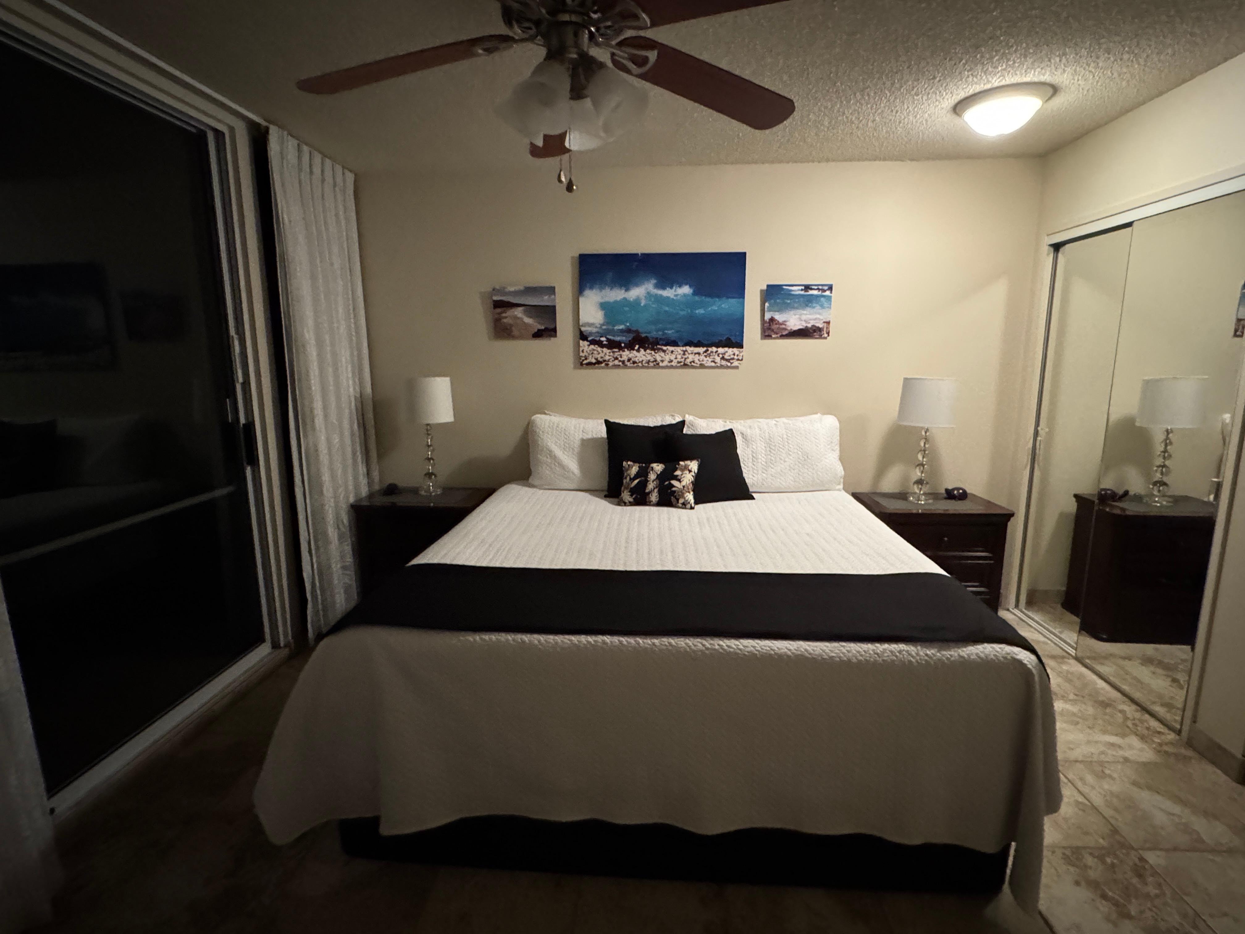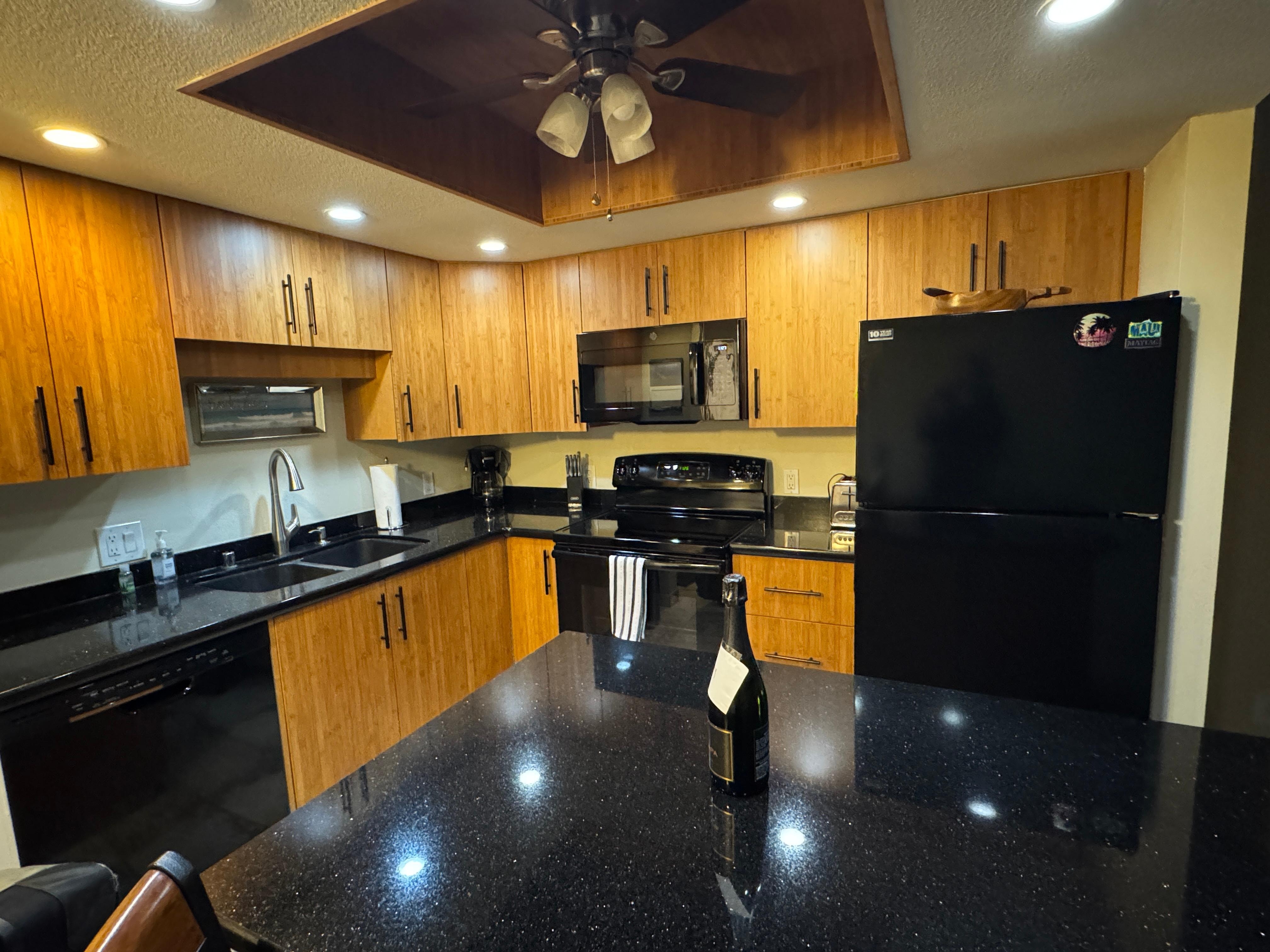 Our unit is not part of a 2 bedroom or lock-off! Read listings carefully. The Maui Banyan is located in a hotel zone, close to Wailea! You will love our beautifully renovated and decorated 1 bedroom 2 full bathrooms and fully equipped kitchen. Unit is located in the H building, on the quiet side of the building, close to the beach but away from the noise of Kihei Road. There is a king size bed in the bedroom. Brand new sofa (not a sofa bed) in living area. Floor plan is open with French pocket door separating the living area and bedroom. We have a 55 inch curved TV in the living room and a smaller flat screen in the bedroom. All appliances are updated with a quiet, efficient Mitsubishi split AC system. Tile floors throughout, granite counter tops and bamboo cabinets.