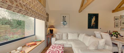 A spacious kitchen with a centre island, vast handmade kitchen table and bespoke antler chandelier makes entertaining easy, while a cosy corner with low-lit lamps and a pair of leather armchairs plus a large 50” screen Smart television and ample seating for fourteen on huge comfortable sofas makes relaxing even easier!