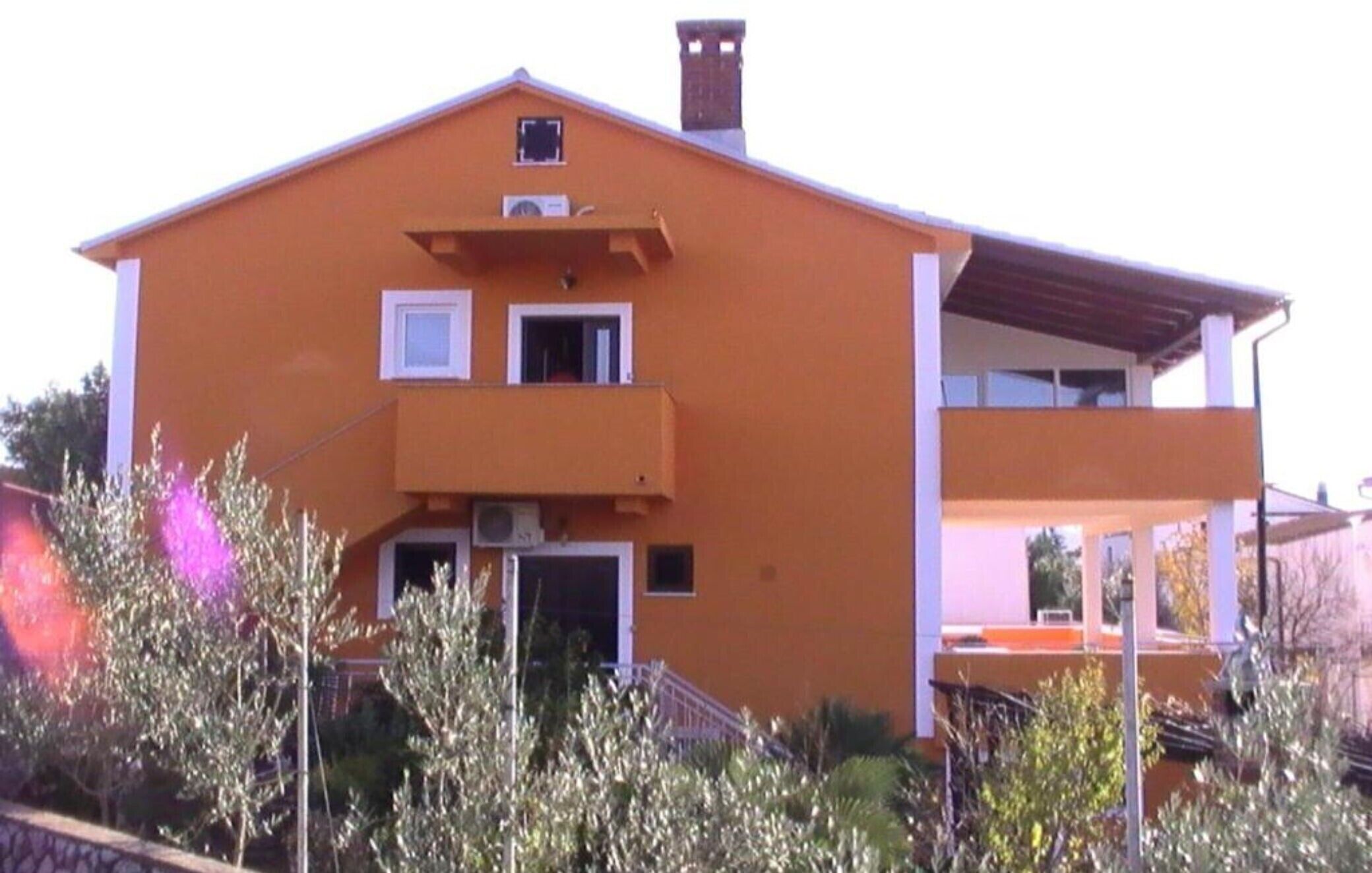 Krk. The holiday flat is located on an enclosed garden plot with flowers and shrubs, bordered by a fence and a hedge. The landlord lives permanently in the house but uses a separate entrance. Access is via a side street (asphalted). Parking (for 1 car) on the property.