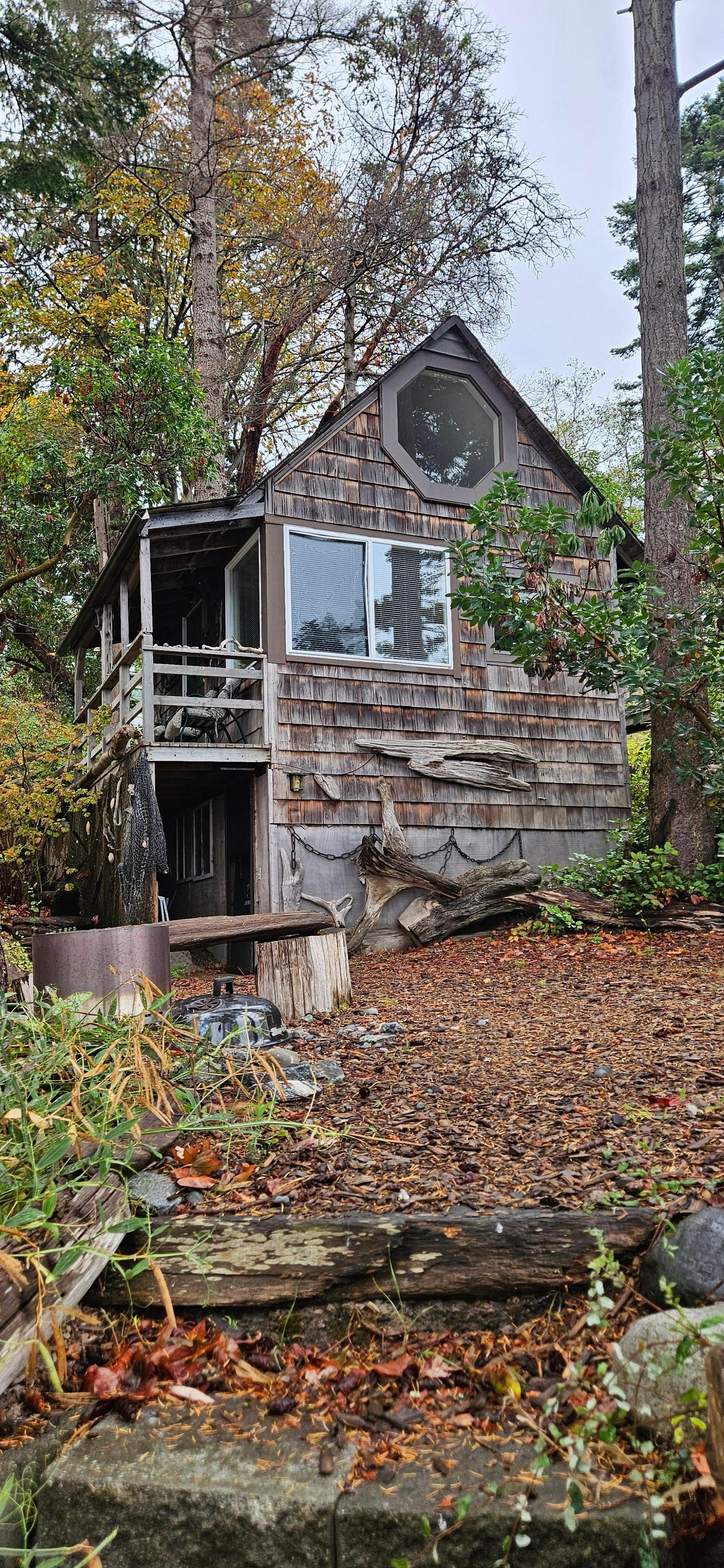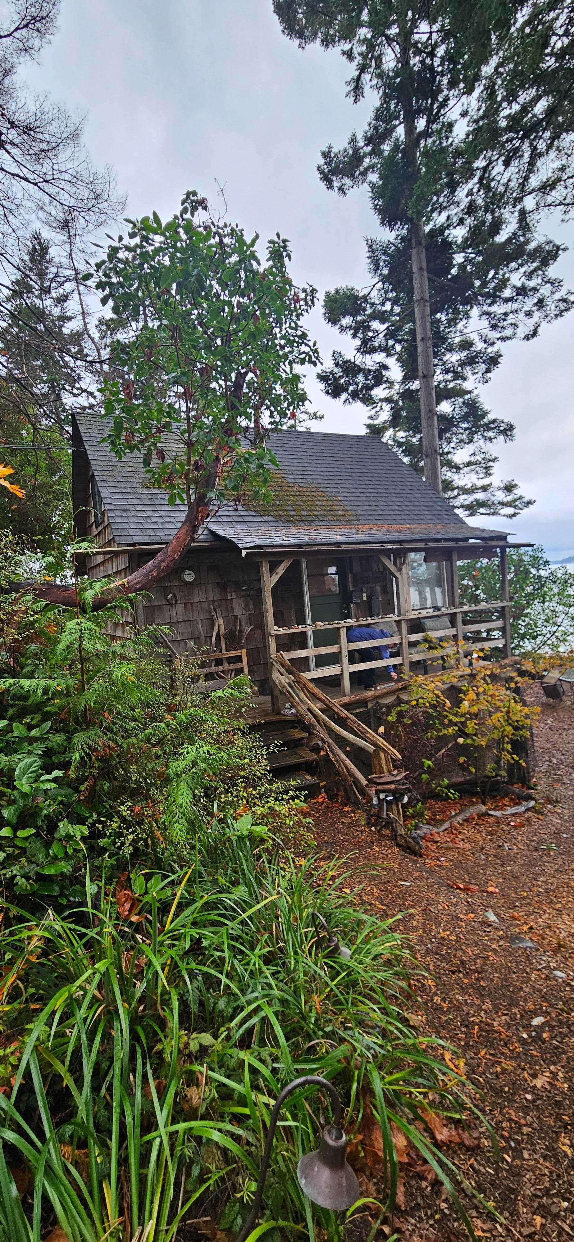 Cozy waterfront cabin with sleeping loft (queen bed) and extra bed in living area (futon). 450 sq feet. Stunning sunsets from this delightful waterfront cabin located among graceful Fir trees and Madronas - home to Eagles, Osprey, Woodpeckers, ducks, seagulls and otters. Take a walk down the unique, hand-hewn driftwood stairs to the rocky beach, or build a fire in the fire pit and relax while watching the sun set. One guest said, 'This is like living in a National Forest on the water.'