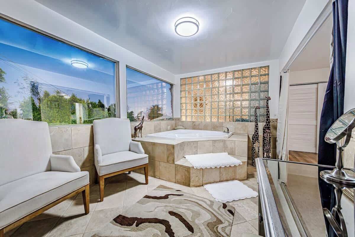 Inside Quinta Green’s living room, huge sliding doors open to combine the outdoor entertainment area with the airy interior. Let fresh air flow through the house as you curl up in the living room near the fireplace or prepare a treat in the spacious kitchen. Modern design and contemporary decor fill every corner, including the seven bedrooms with various sleeping arrangements. For a Coachella escape like no other, this La Quinta home is waiting with style, space, and plenty of ways to stay cool.