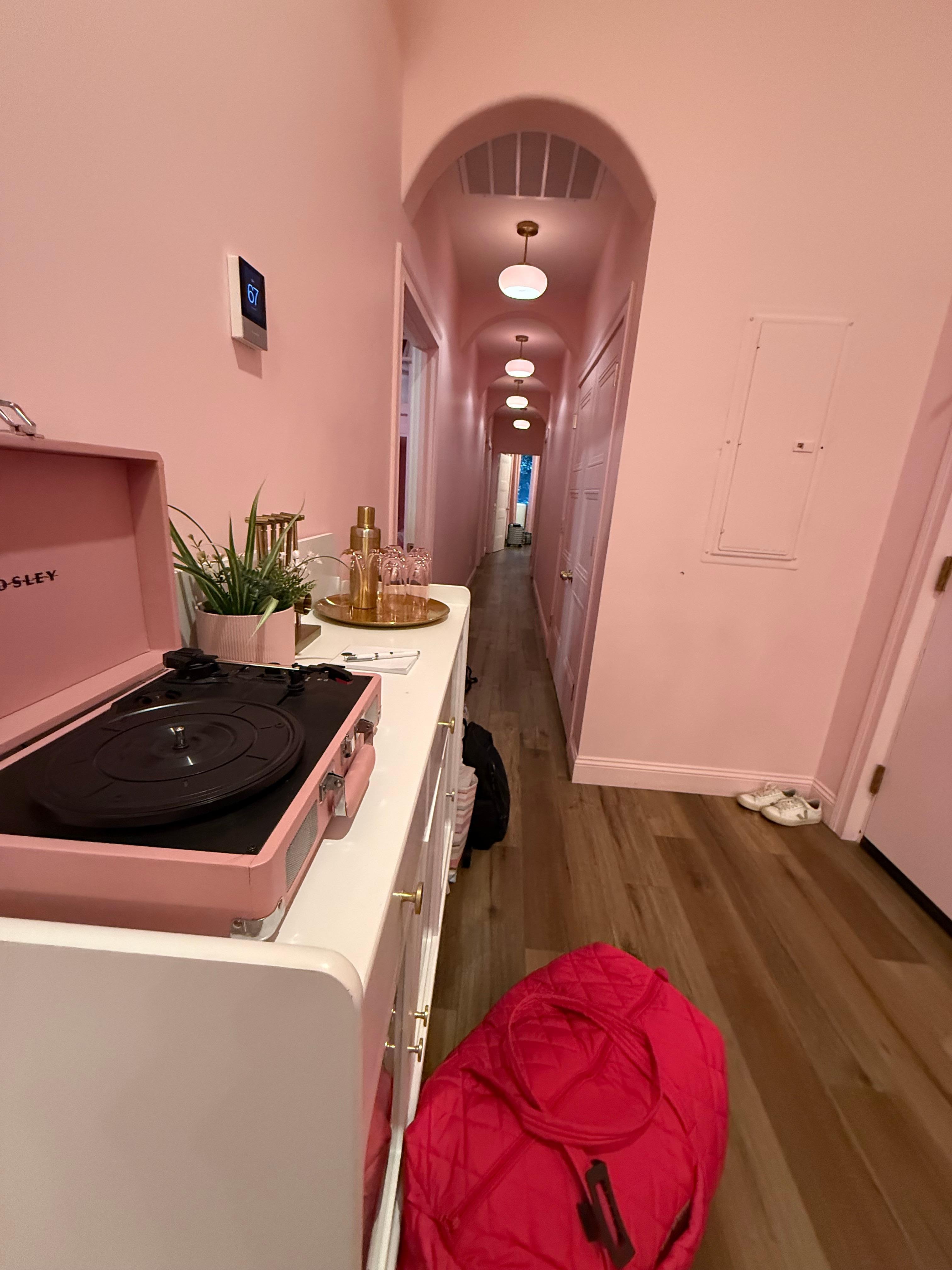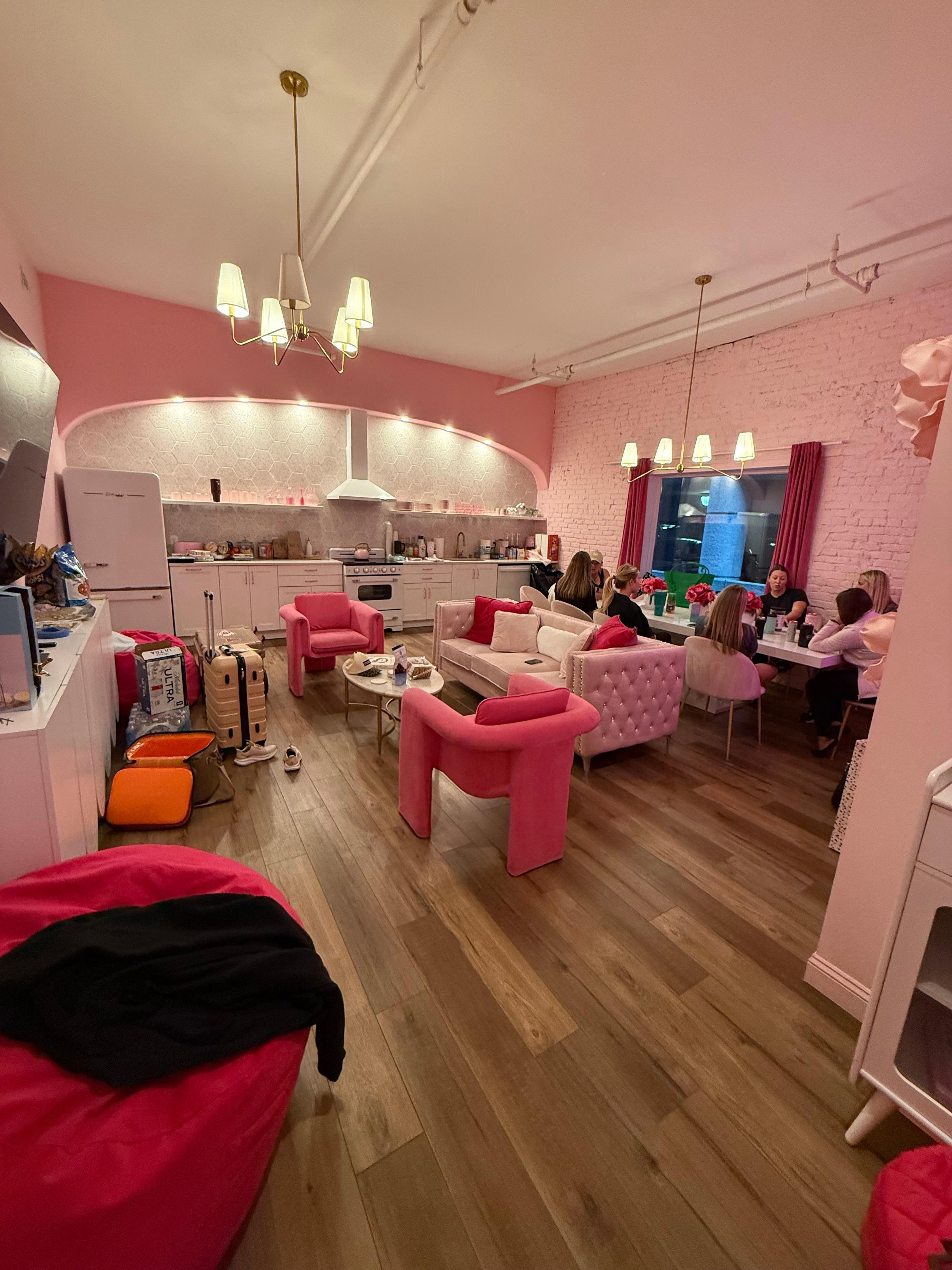 I hope you like pink! Right in the middle of it all, you're steps away from the best dining and entertainment Louisville has to offer. Across the street from the convention center, you're in the perfect spot! One of many suites in our building, search "hollyhock suites Louisville" to see all our options and availability. This is a 4 bedroom, 2 bath with an 85 inch smart tv and chef's kitchen. Free Wi-Fi and conference rooms are available onsite!