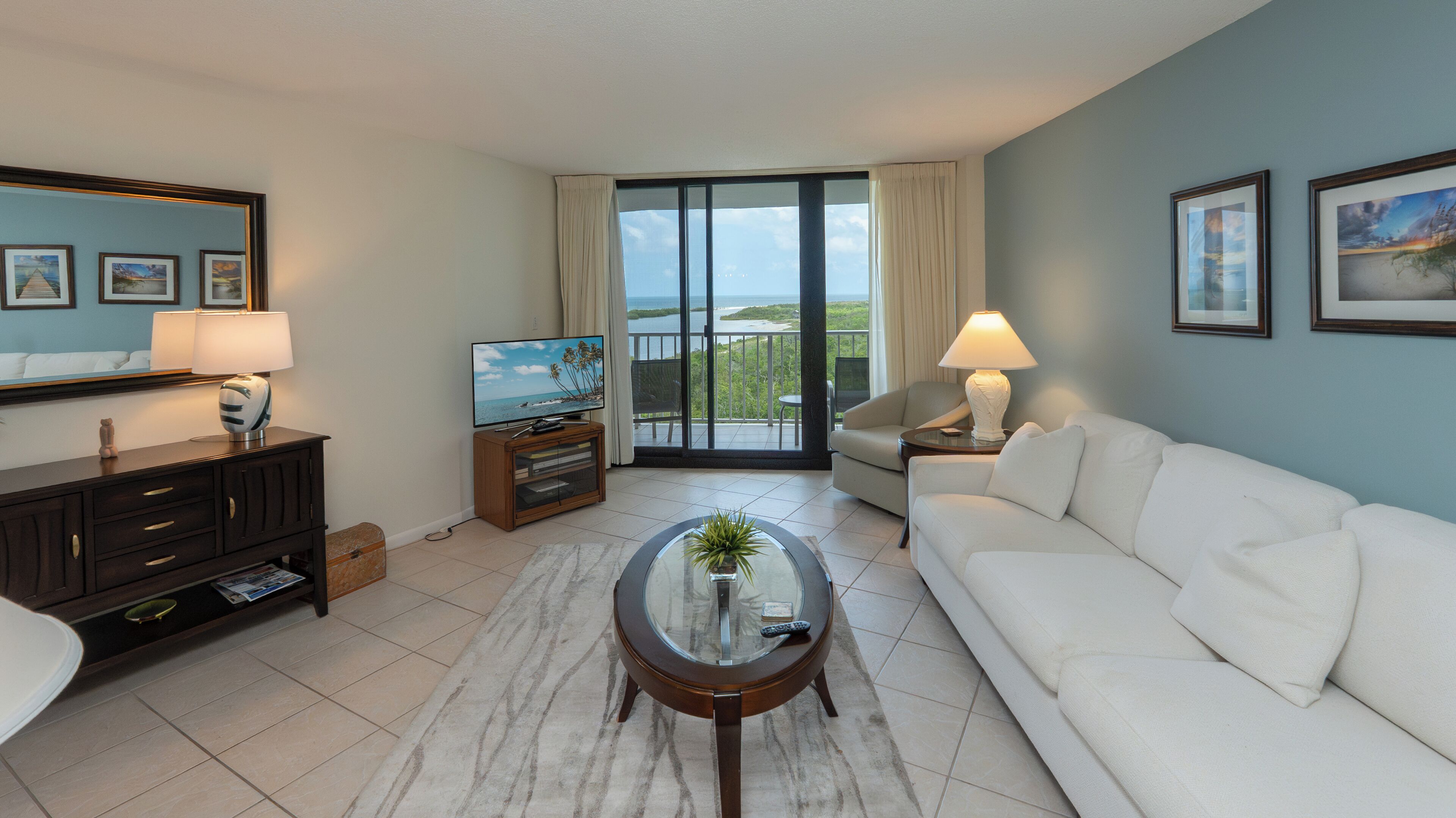 The interior of the unit takes its inspiration from the beach next door. A floor of marble-hued tile is brightened by natural light through floor-to-ceiling windows. Wall openings connect the kitchen and living room, giving the unit a wide-open feel. Style is in the details, and this is unit is filled with decorative touches like an anchor paperweight, palm trees on the clock face and colorful sketches of crabs, sea horses and an octopus.