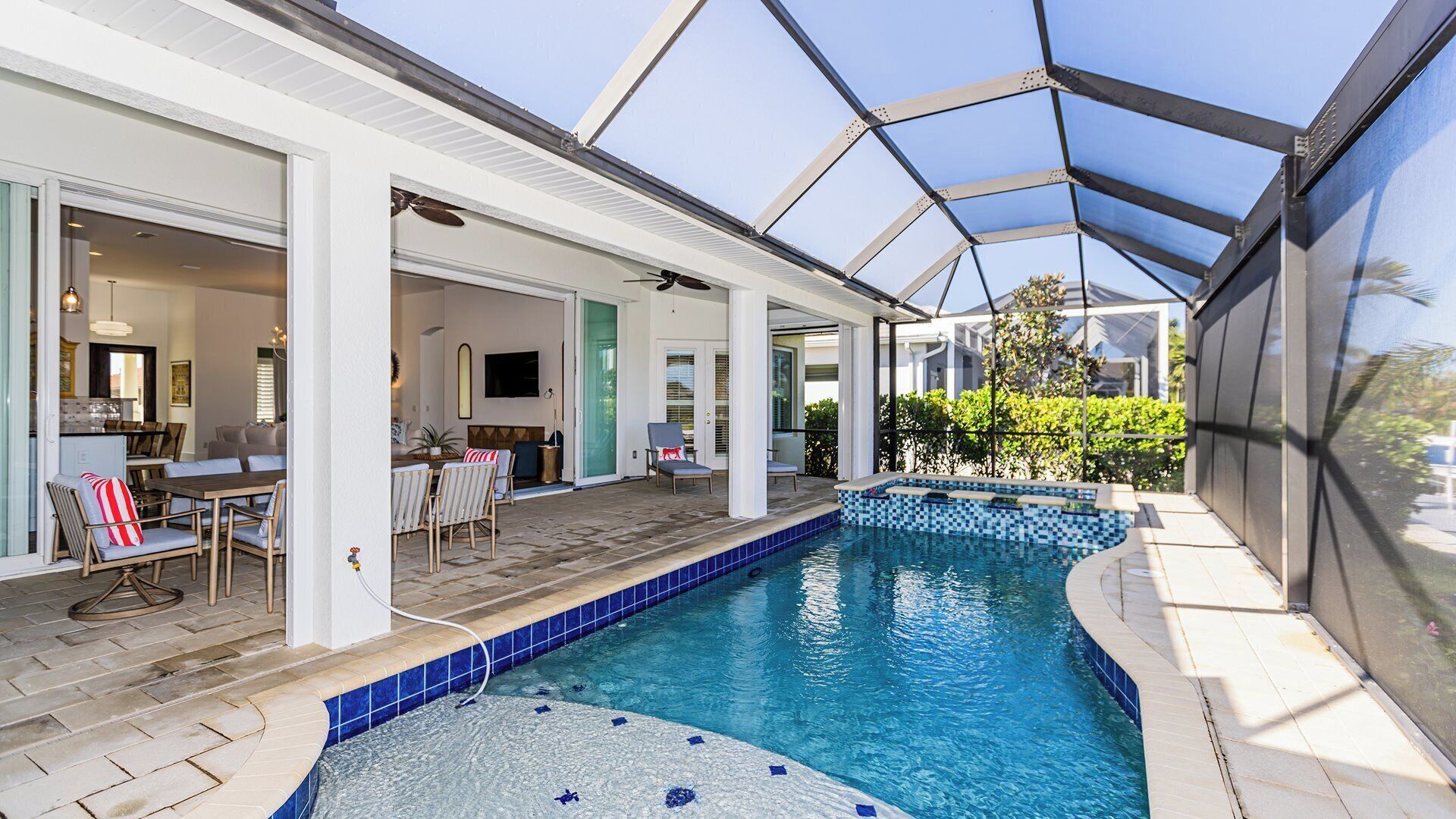 Step outside to your private backyard oasis, where you can soak up the Florida sun in the sparkling pool or unwind in the jacuzzi under the stars. The expansive outdoor space features ample seating for lounging, dining, and entertaining, whether you're sipping your morning coffee or hosting a sunset happy hour. For disclosure, the jacuzzi is only available for guests over the age of 13 for safety reasons.