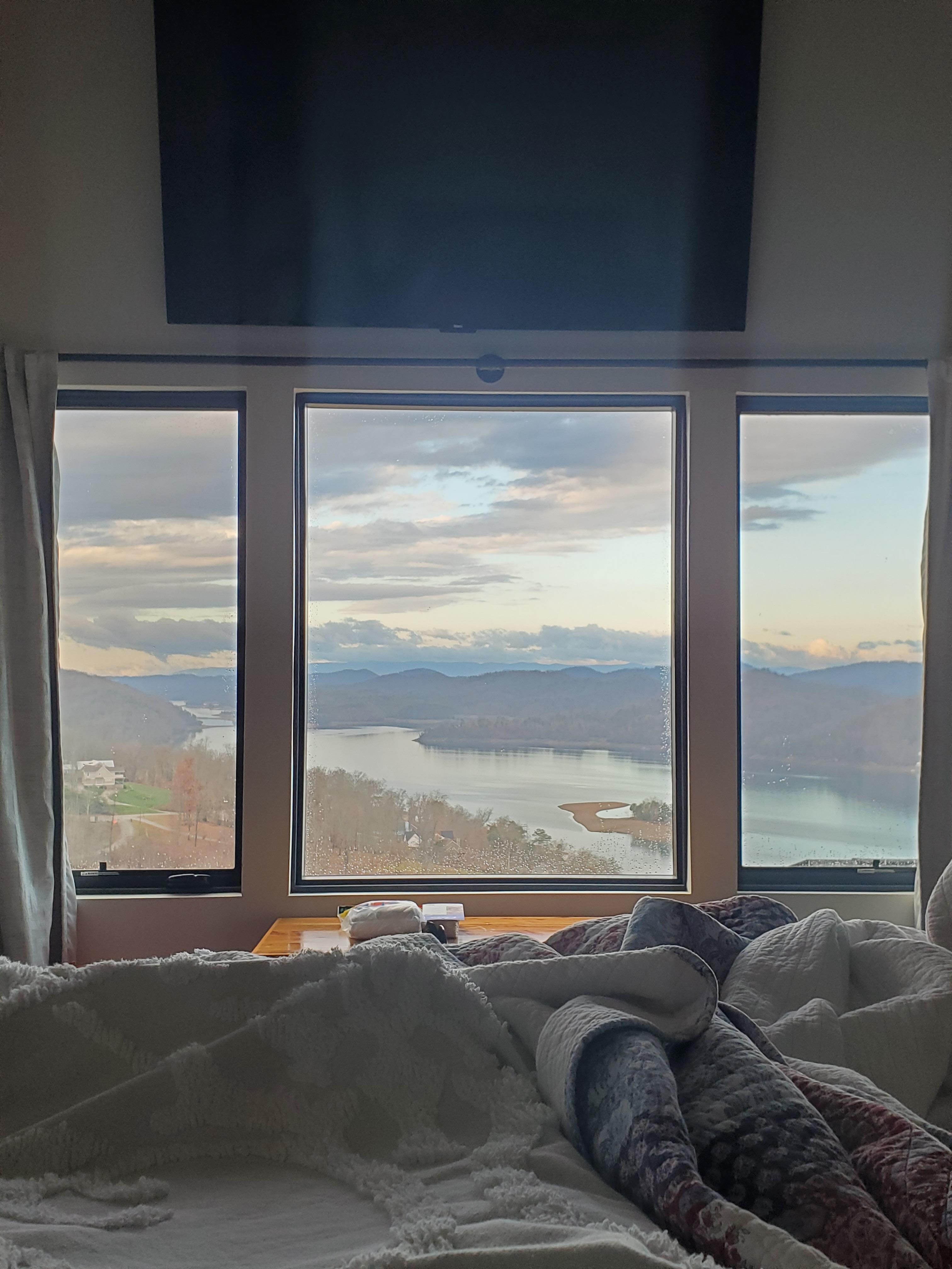 Our king size master suite has a premium hybrid Purple mattress, Purple pillows, radiant heat flooring in the bathroom, heated bidet, and soaking tub that allows for stunning views of Norris Lake.