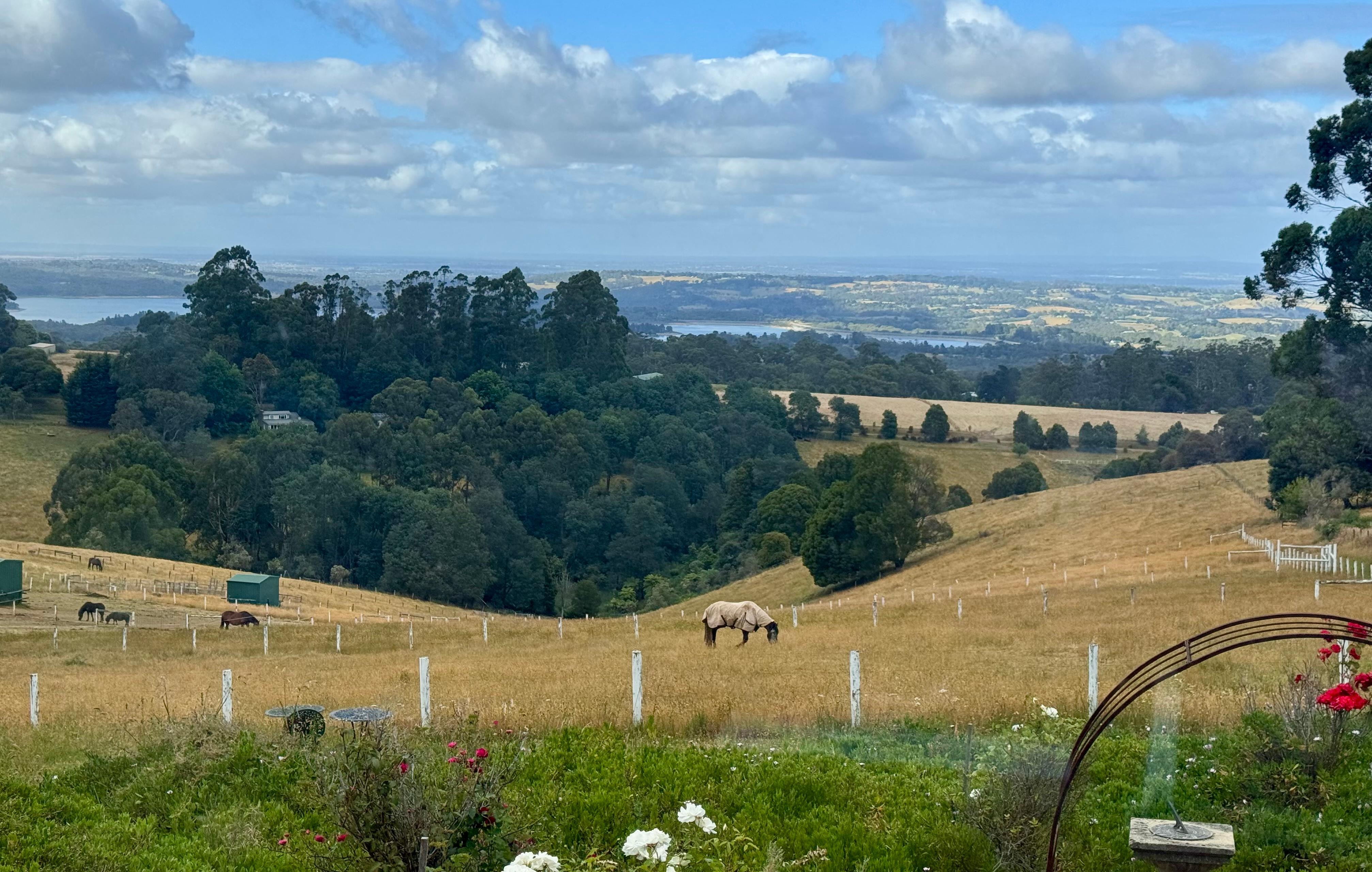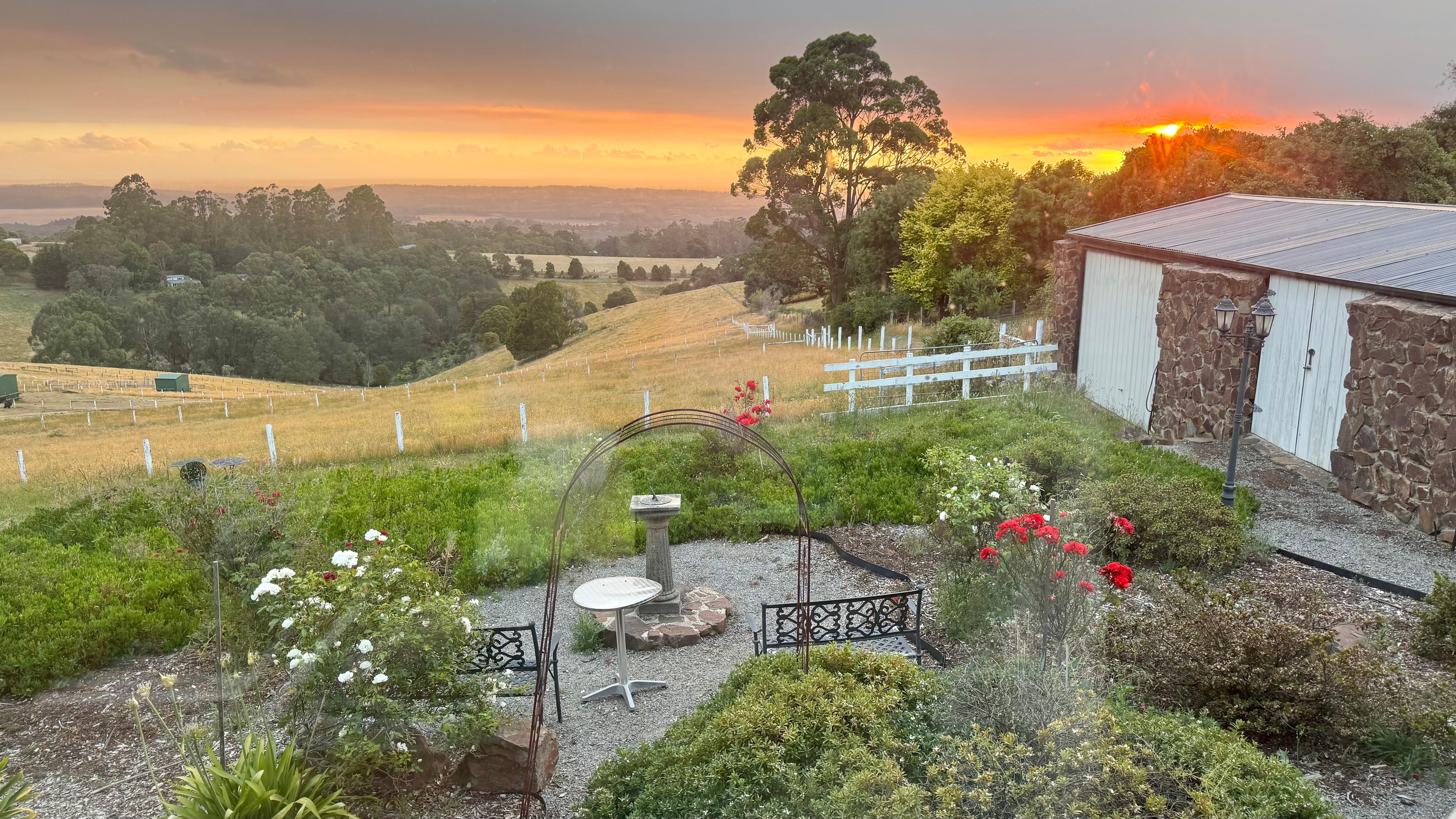 A Cottage with a View at Tudor Ridge stands on 32 acres of farm land encompassing some of the most magnificent views in Melbourne. Views are down the Mornington Peninsula to Cardinia Reservoir and the Bays. Relax on the recliner lounge while taking in panoramic views. Imagine lying in the main bed with a postcard view of the Peninsula during the day or night.