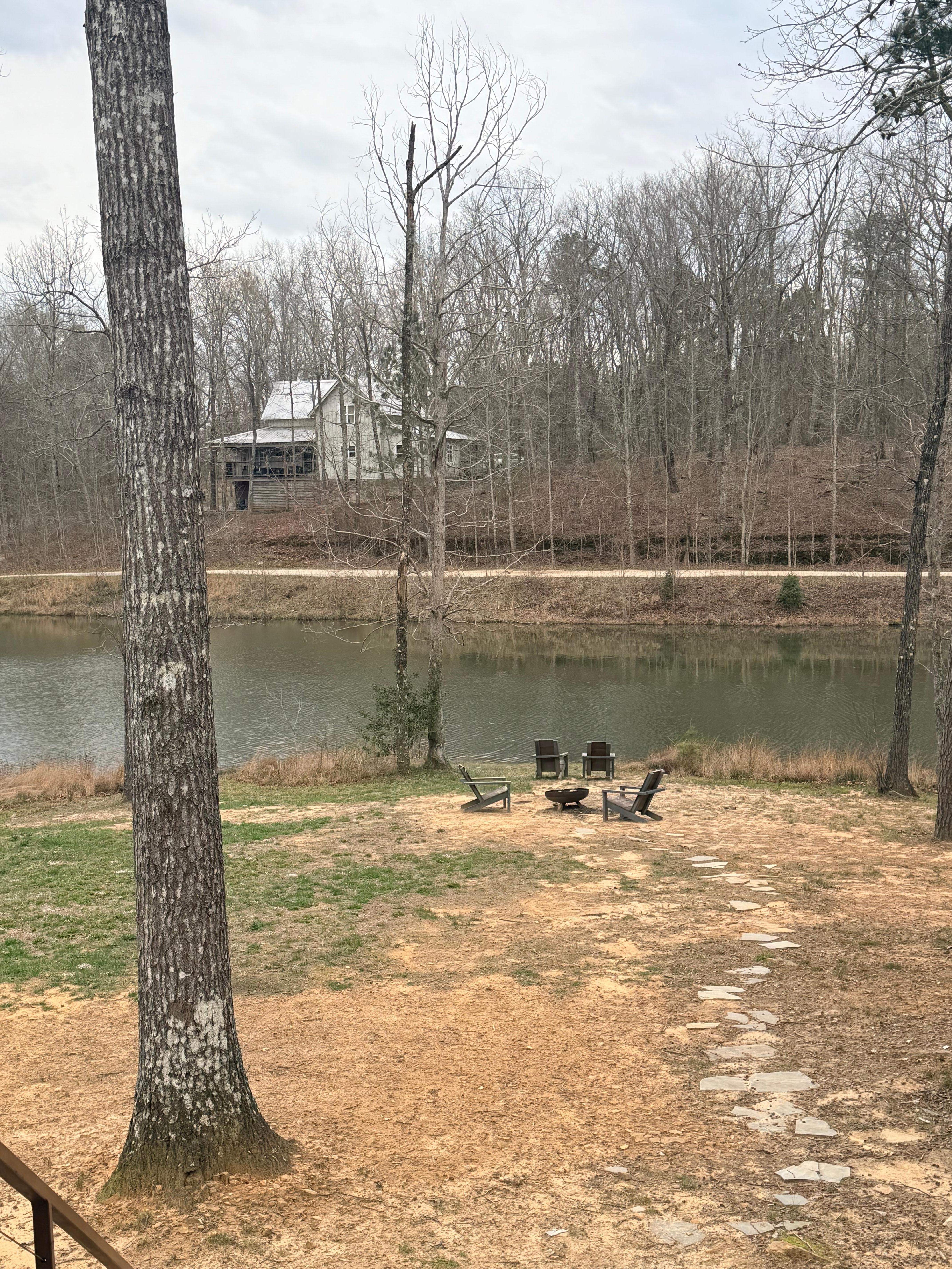 The Away Place is a lakeside home with fireplace, hot tub, fire pit and kayaks. Located just 4 miles from downtown Mentone and also 4 miles from DeSoto State Park, The Away Place is modern living with a rustic, vintage vibe. Open living room with gas log fireplace and smart tv, open dining area that seats 6 and open kitchen with island seating 4 ensure that there is plenty of room for everyone! Just off the kitchen is a covered porch overlooking the lake with hot tub and more seating. The King bedroom with ensuite bath also leads out to the covered back porch. The second bedroom with two twin beds and third bedroom with Queen bed make this amazing property sleep up to 6 comfortably. Drink your morning coffee from the back porch overlooking the lake, sip a glass of wine while watching the sun set, and finish your day enjoying s'mores and making memories lakeside at the fire pit. Outdoors is a rustic landscape of trees and amazing color, making it the ultimate "Away Place" on the lake.