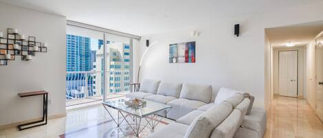 The main living space is professionally designed to be tasteful and comfortable for your stay. The kitchen has everything you need including top-of-the-line appliances such as a glass top stove, oven, toaster, a Nespresso coffeemaker, cooking pots, and utensils followed by the dining area with a table for 6 people and access to the balcony with panoramic views of Biscayne Bay where you can sit back and enjoy amazing sunsets!!!