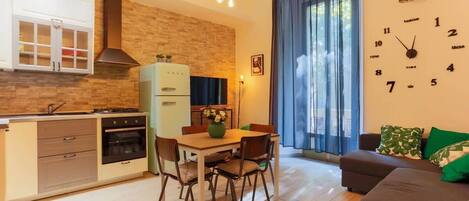The living area includes a fully equipped kitchen, a TV area with a sofa bed, a dining table and chairs—ideal for both working and dining.