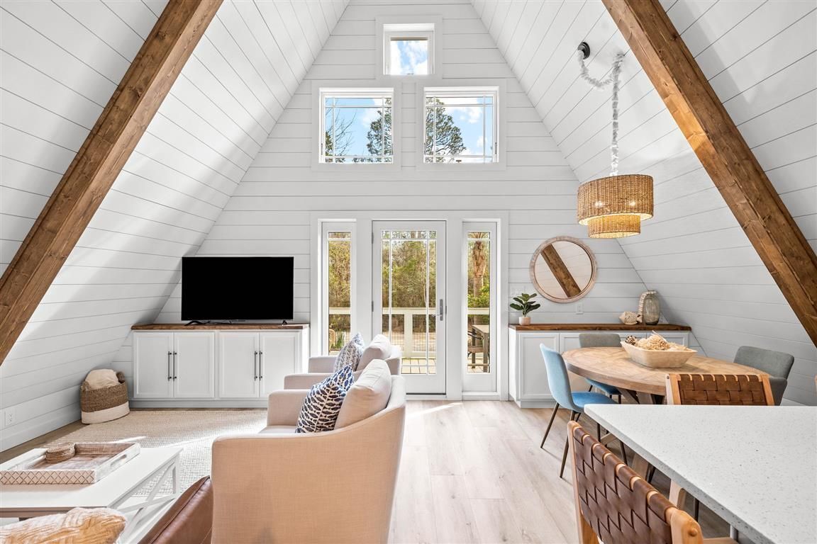 White wood paneled walls and natural wood flooring inside of the home sweep you into beach cottage bliss. The open concept first floor features a sizable kitchen with stainless-steel appliances and a spacious counter bar for socializing. The living area opens to the private back patio outfitted with a propane grill and TV. The back patio also has a remote-controlled screen that can be opened or closed for comfort. A bedroom with a queen bed and en suite bathroom is also on the first floor.