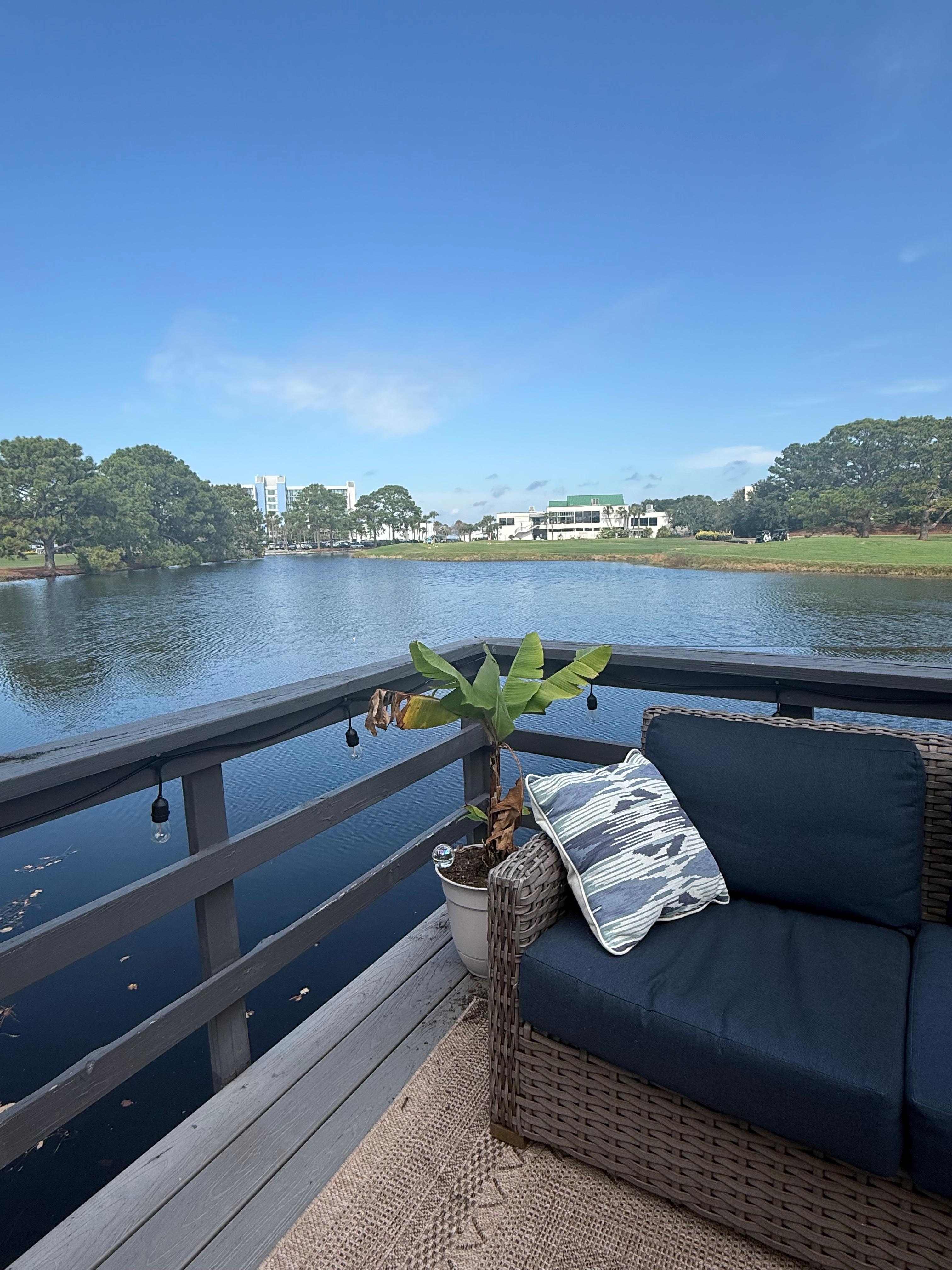 The home features two bedrooms and two bathrooms on the ground floor and one bedroom and bathroom upstairs. There is also a desk workspace on the 2nd floor in the loft area for convenience. The master suite is located on the 2nd floor with a private balcony overlooking the water and golf course with lounge chairs for relaxation.