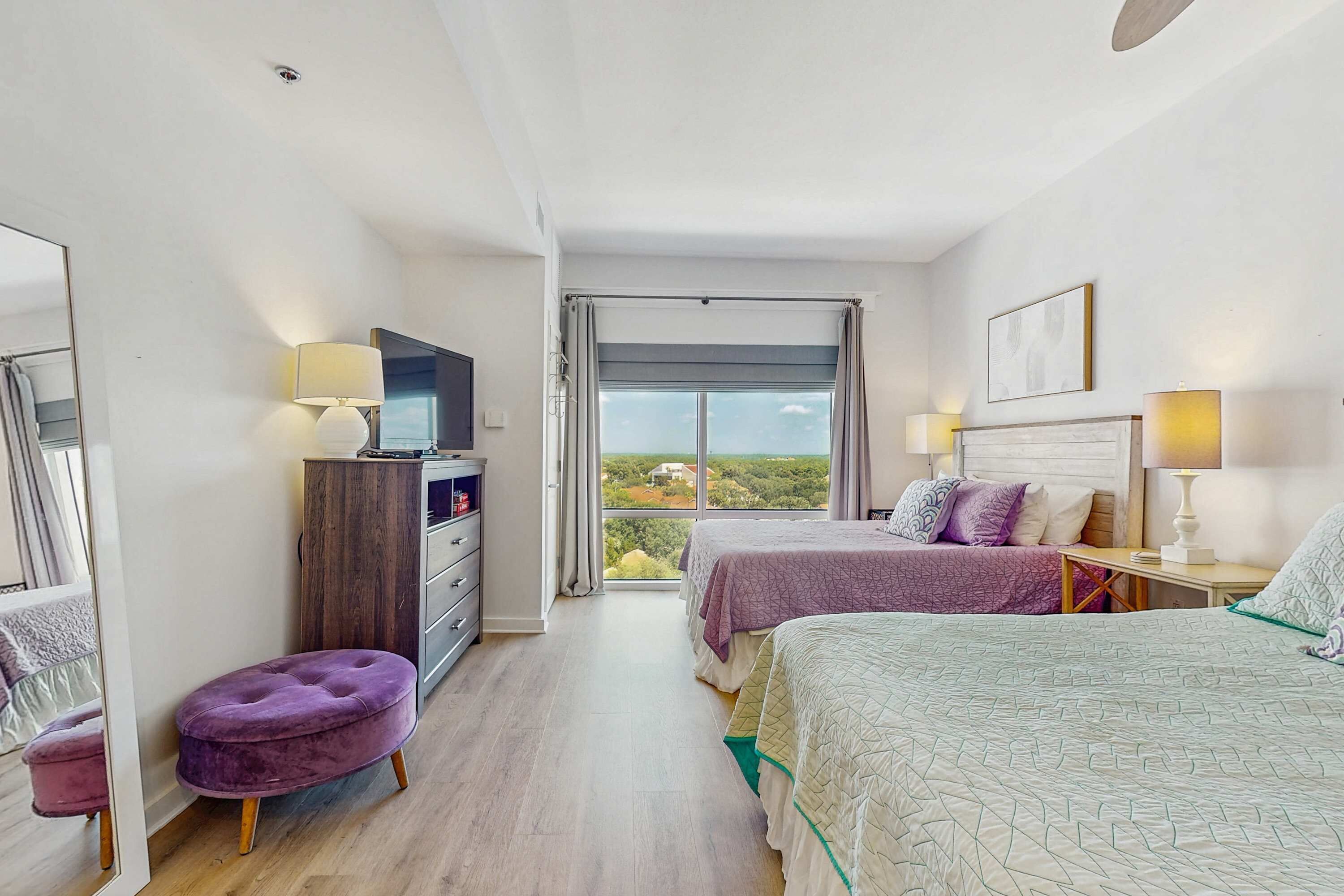 When you walk into this custom space, you’ll be greeted by brand new furnishings/fixtures, new plank flooring, and floor to ceiling windows throughout, so you never miss the views of the shoreline and iconic Gulf sunsets. The kitchen is equipped with new stainless-steel appliances, breakfast bar seating, and custom pantry space featuring a wine fridge and coffee bar. Grab that morning coffee in style and a seat at the dining table overlooking the beach, golf course, resort, and lake. Spend time here making unforgettable memories or head to the living room for more views of the shoreline and wind down with the Smart TV. Don’t forget the wraparound balcony featuring comfy furnishings and stellar views of the Gulf, Choctawhatchee Bay, golf course, and entire resort.