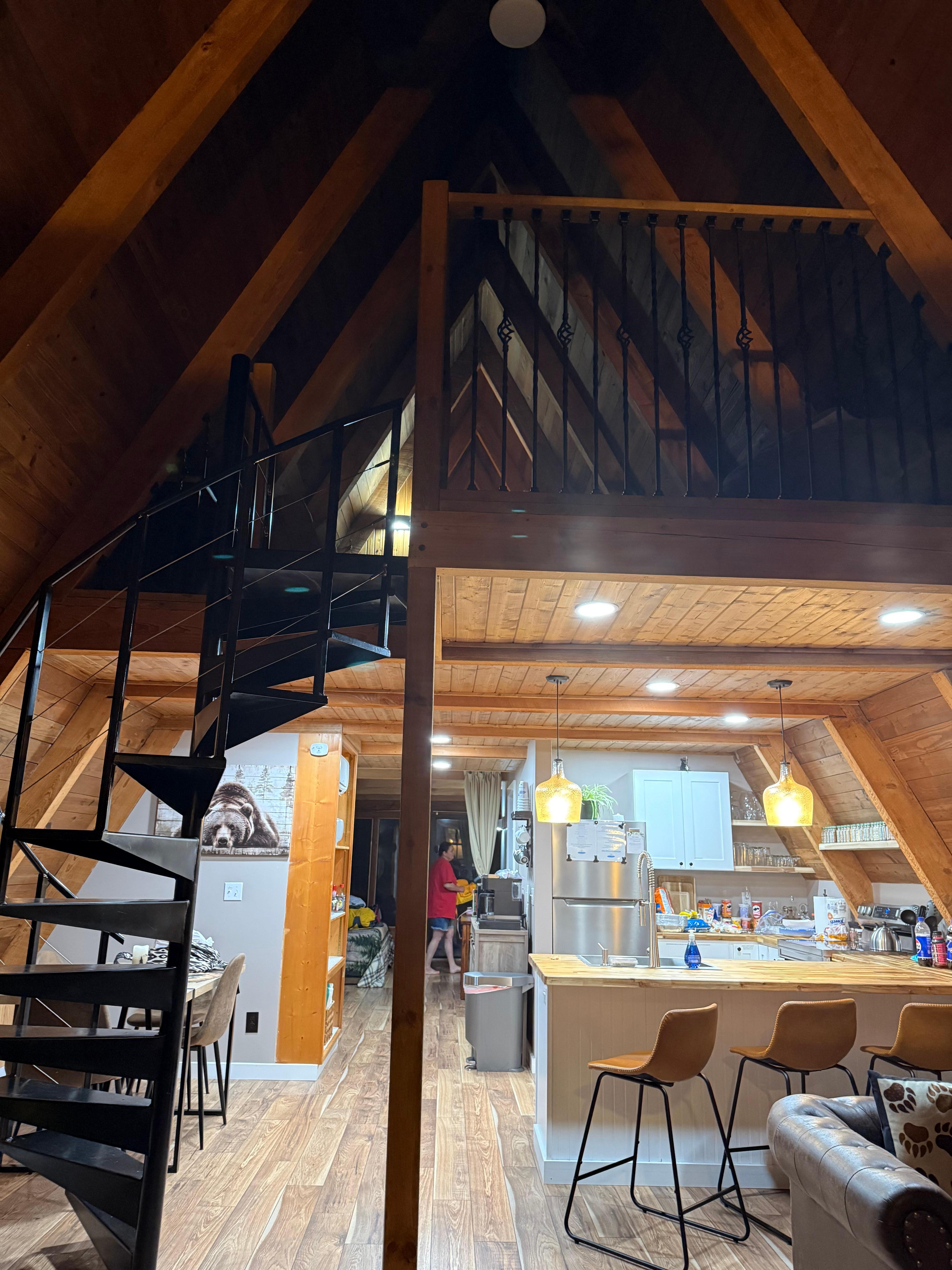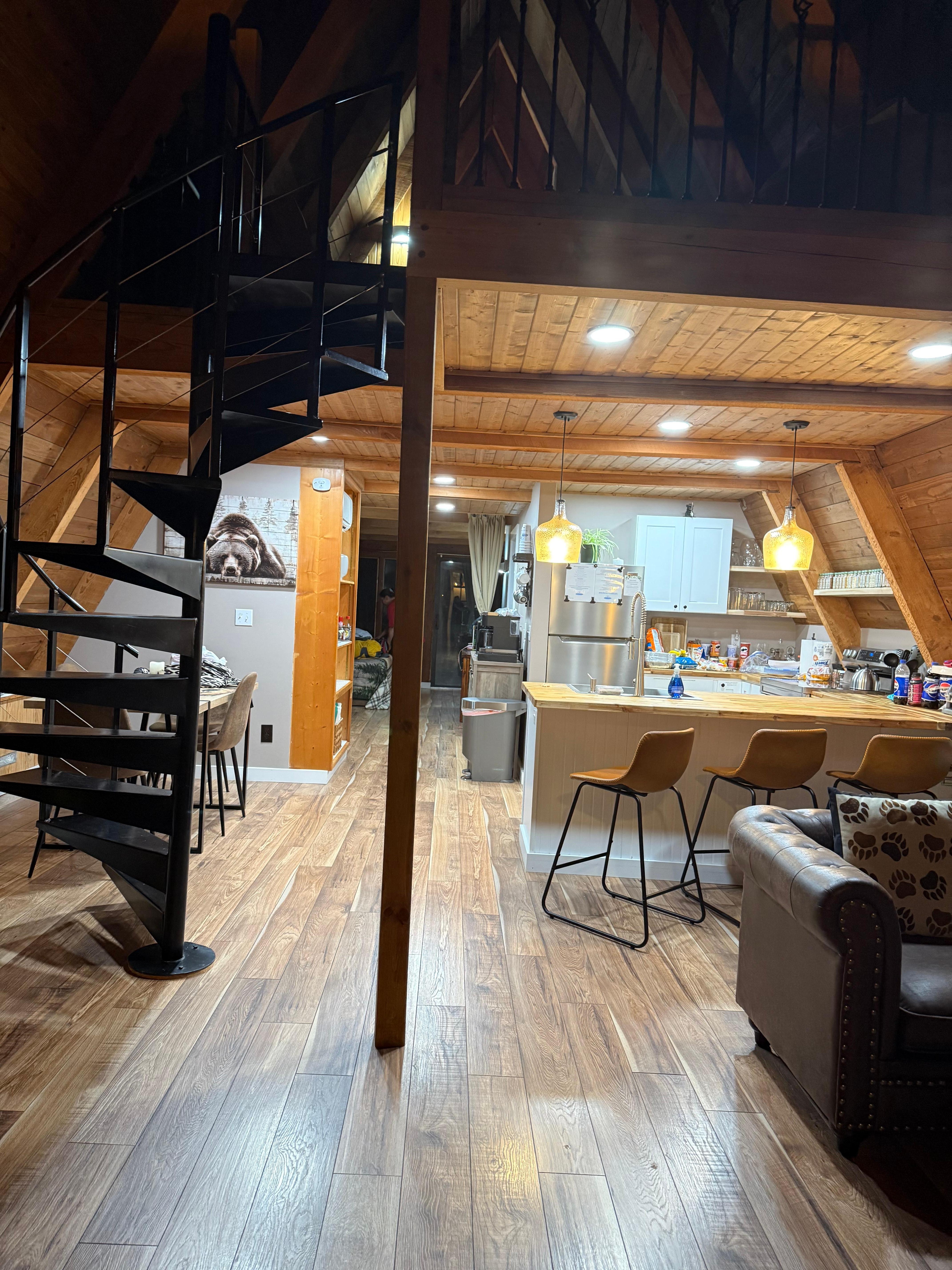 Step into Bearadise A-Frame’s living room via convenient keyless entry and go claim your sleeping space from your choice of three!