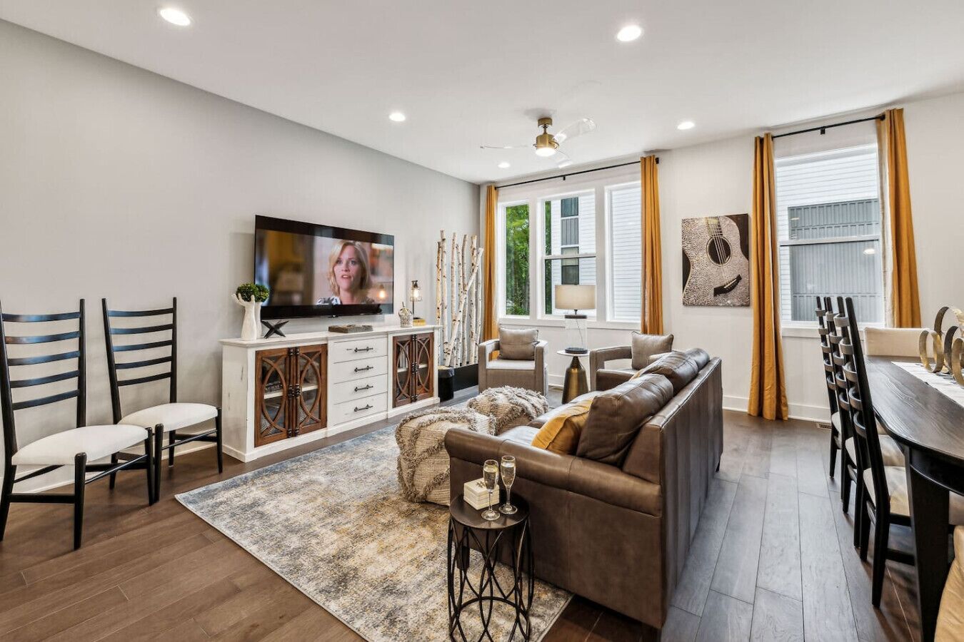 Living Room – The living area features a dining table that seats six, a Smart TV for entertainment, and large windows that fill the space with natural light.
