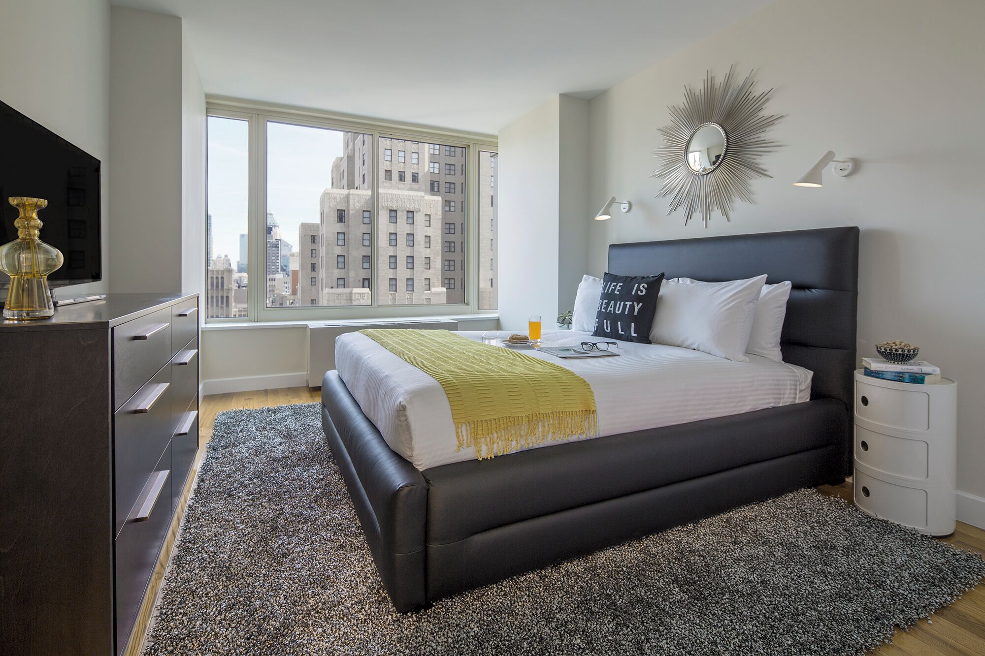 This ultra-stylish, uniquely designed one-bedroom apartment in a luxury Chelsea building features hardwood floors, large windows letting in copious natural light and great city views, an open kitchen, generous closet space and high-end finishes and appliances. The bed provided is queen size, fitted with plush linen sheets and pillows. All Furnished Quarters apartments include 24/7 guest service.