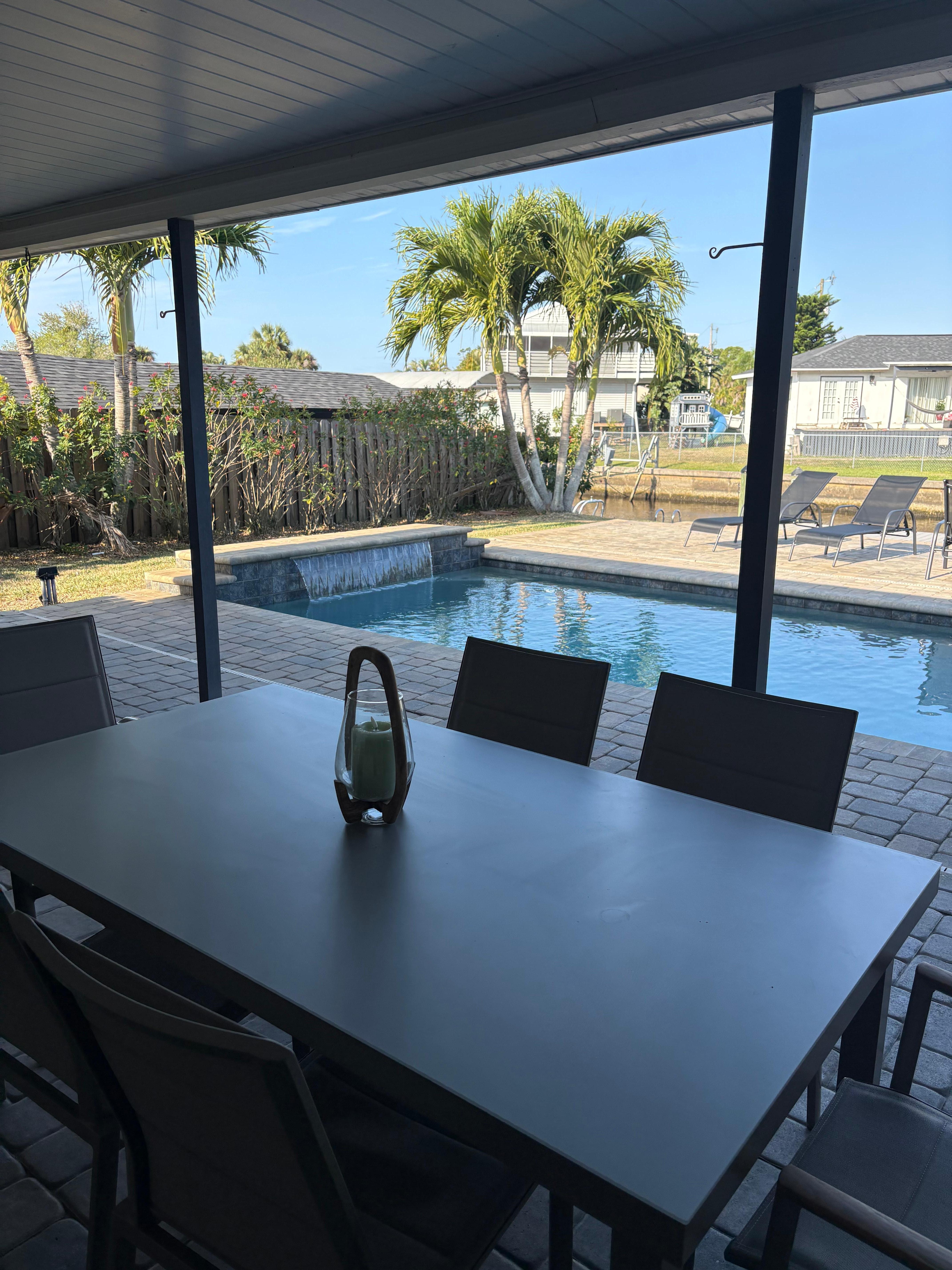 Escape to your own slice of paradise in this beautiful North Fort Myers home, perfectly situated on a direct Gulf access canal. Start your day with a cup of coffee on the spacious, oversized pool deck, then take a refreshing dip in the electric heated pool. With plenty of sun loungers, it's the ideal spot for soaking up the Florida sun.
