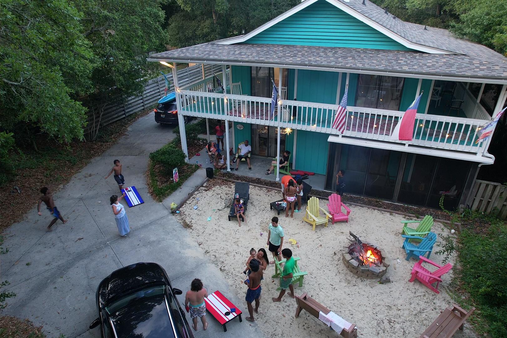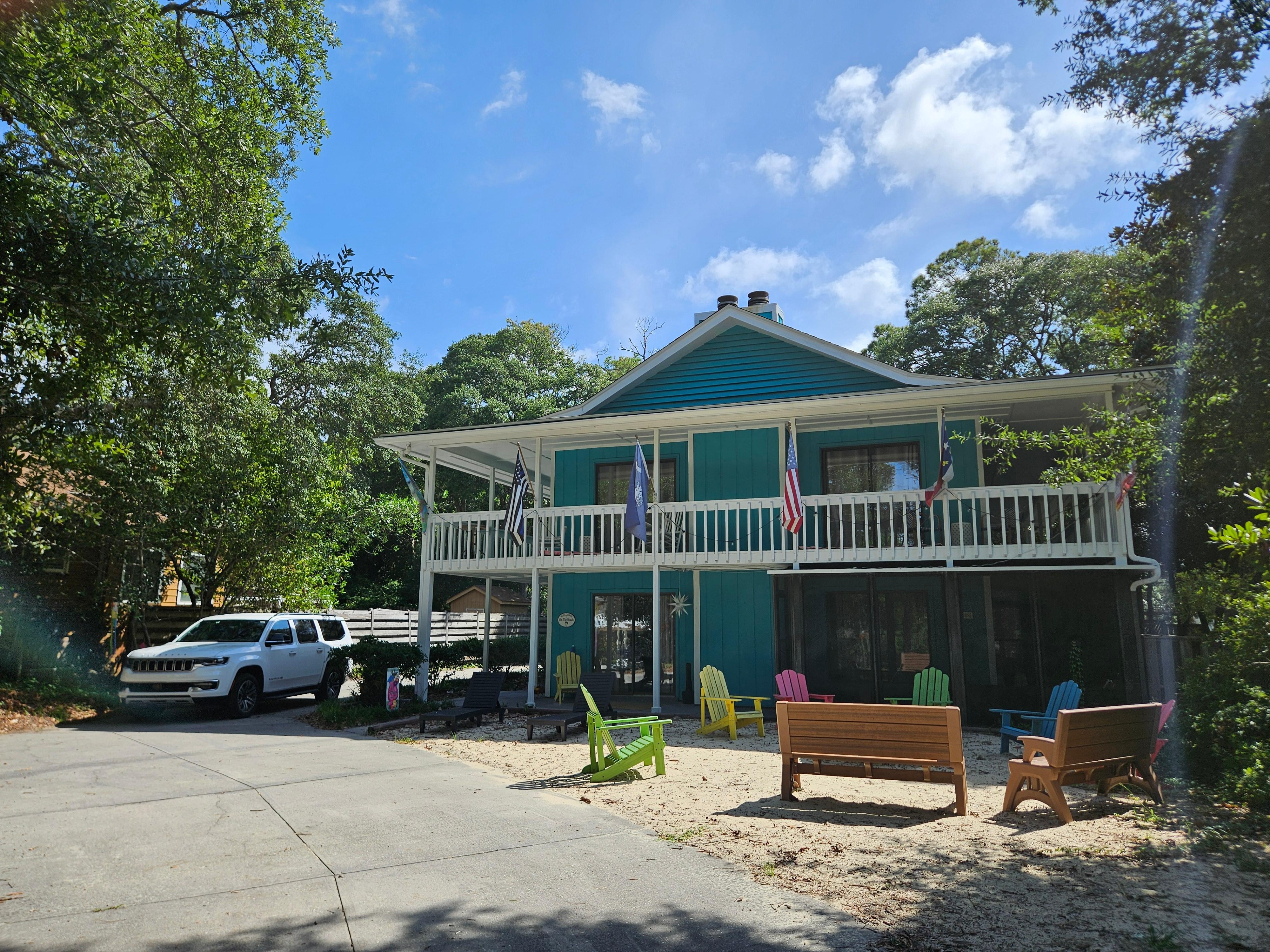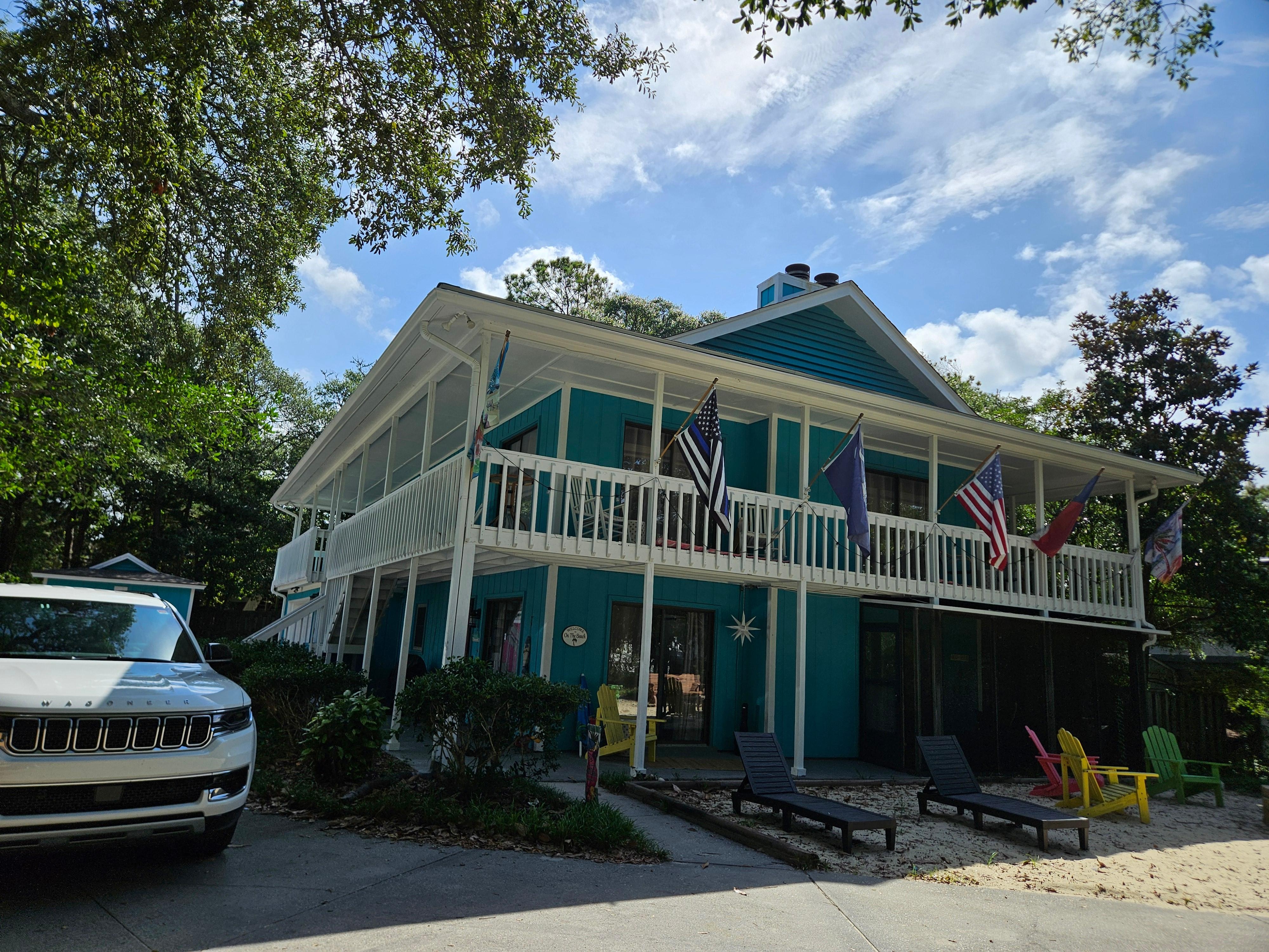 Enjoy all the comforts of home while you are at the beach in this wonderfully decorated beach house that offers 2 living rooms, 2 dining areas, 2 kitchens, 6 TV'S, Wifi and full size washer/dryer. The ground level resembles a mother-in-law suite with 1 bedroom w/king bed, a full bathroom, full kitchen, dining area, living room and a screened in patio. The 2nd floor offers 3 bedrooms, 2 bathrooms, full kitchen, dining area, living room with sleeper sofa & covered balcony with outdoor seating.